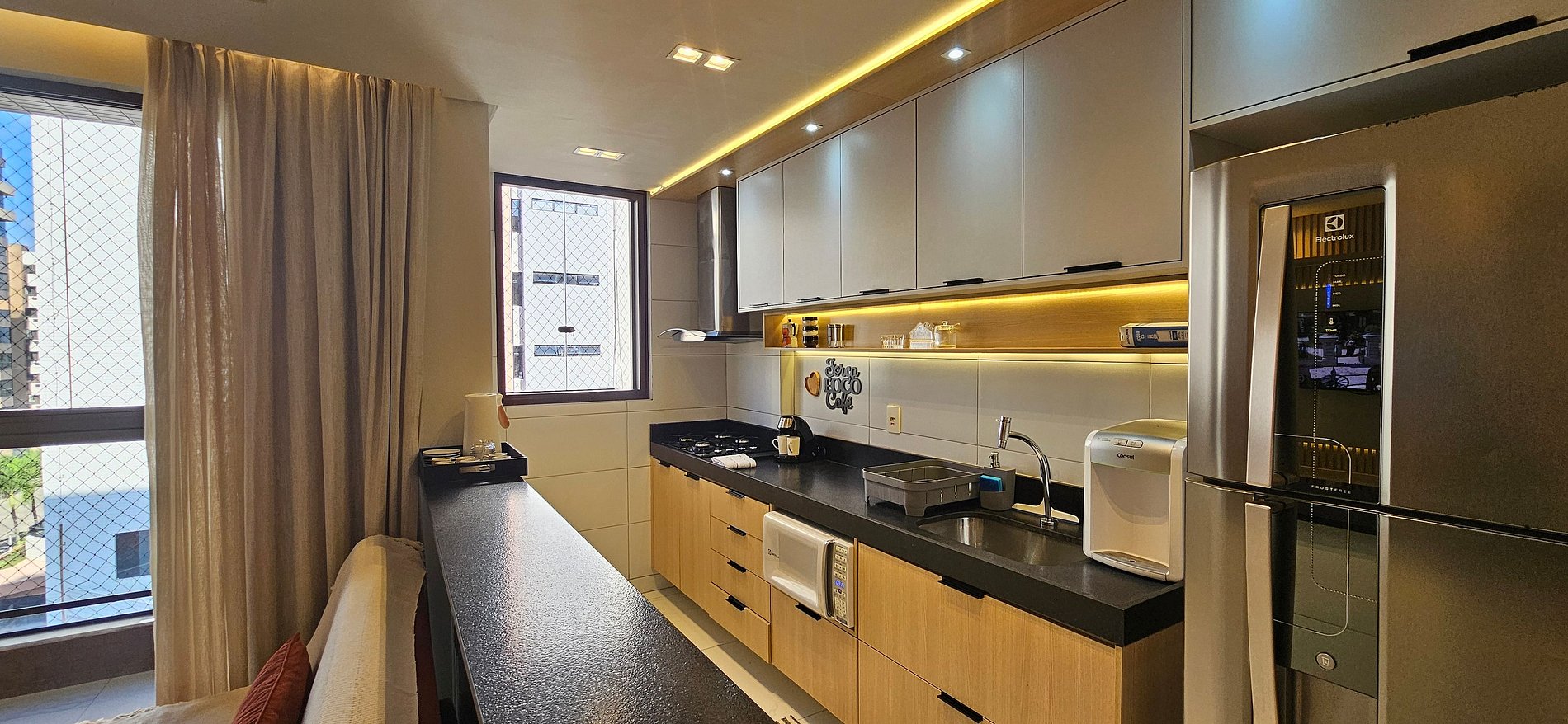 COZINHA: Geladeira com freezer separado, cooktop 4 queimadores, filtro eletrico, cafeteira elétrica, sanduicheira, liquidificador, airfryer, forno microondas, louças, talheres, panelas, cuzcuzeira e demais utensílios de cozinha para o preparo de refeições.