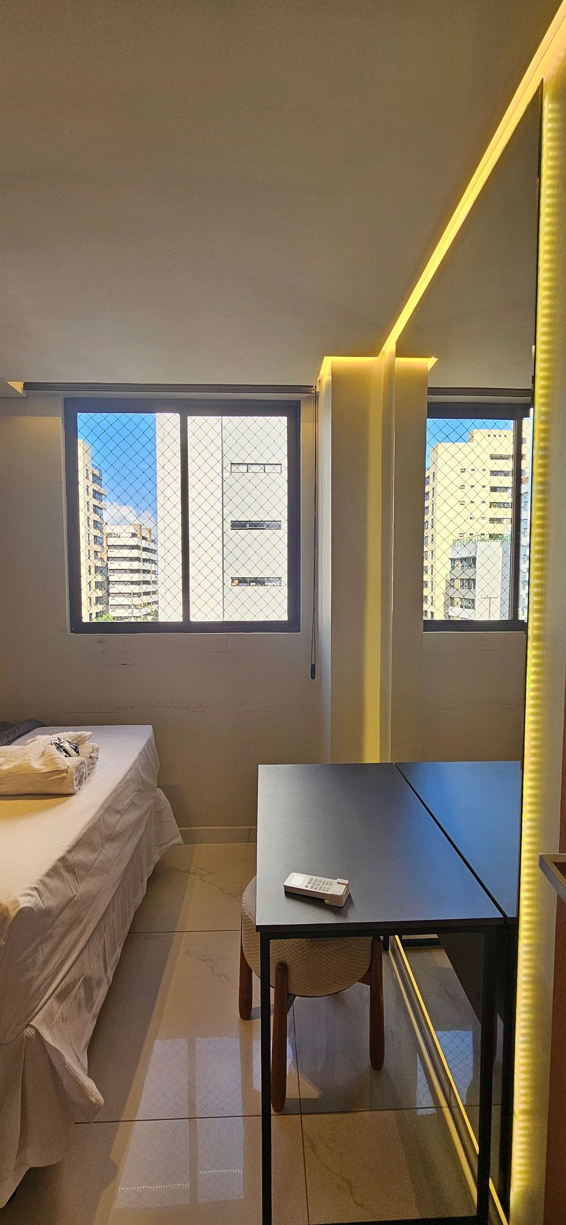 SALA DE ESTAR E JANTAR: Com varanda fechada por vidros (retráteis), possibilitando total abertura para a melhor ventilação. Sofá cama, mesa com 4 cadeiras, cortina, estante, ventilador de coluna e TV Smart.