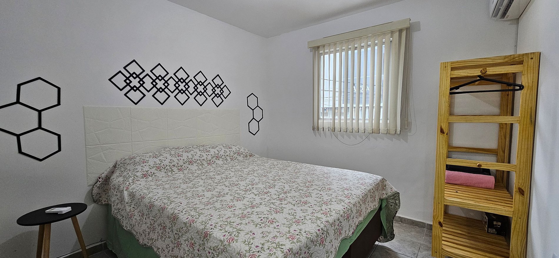 DORMITÓRIO: cama casal, armário para roupas e ar condicionado.