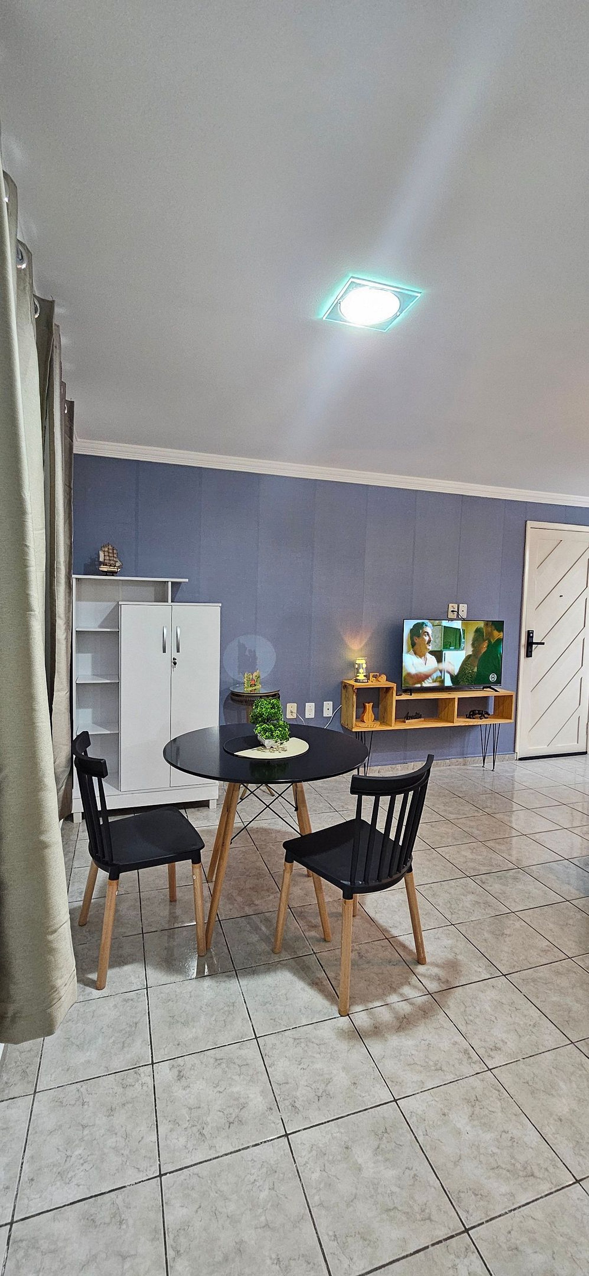 SALA DE ESTAR: Sofá cama, rack com TV Smart e canais abertos, ventilador de coluna.