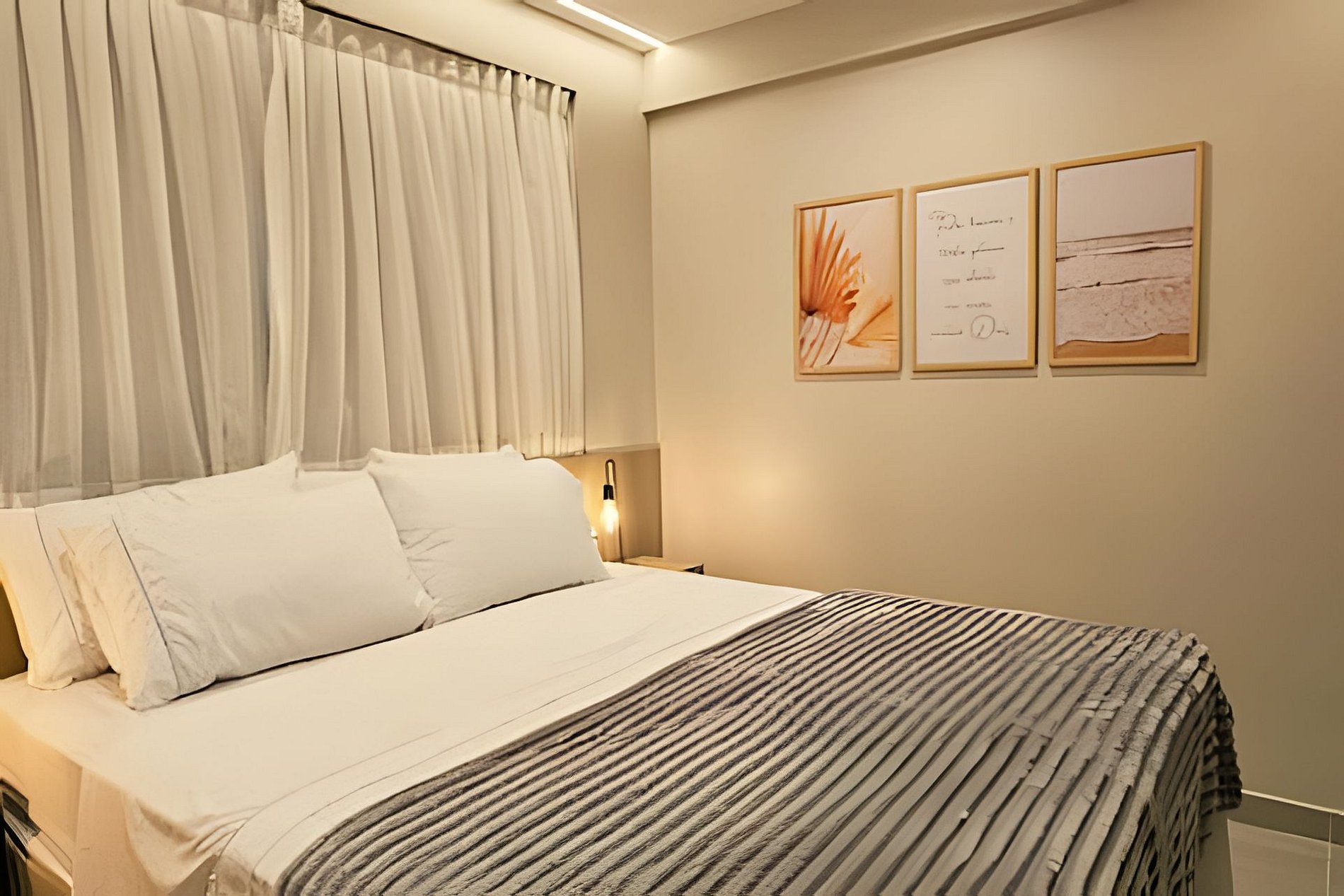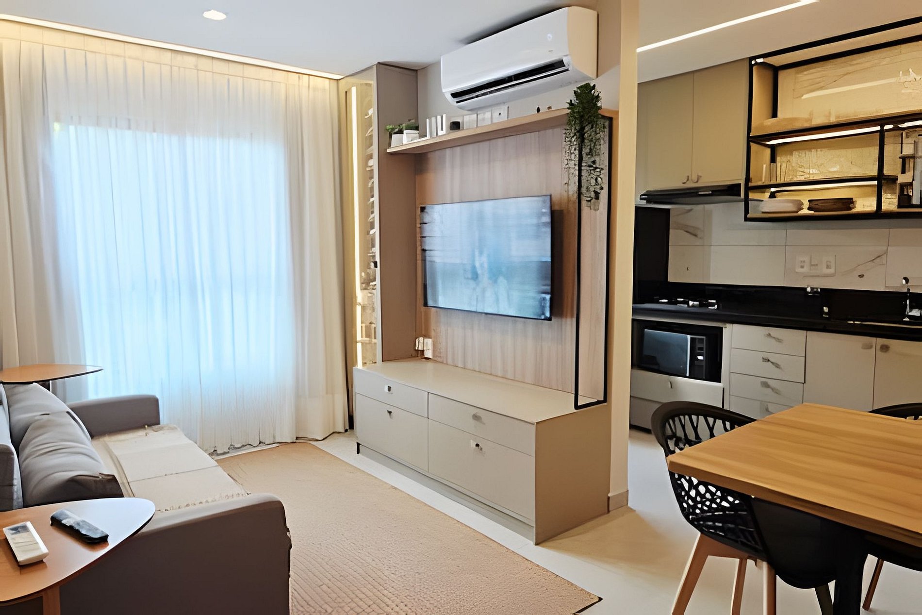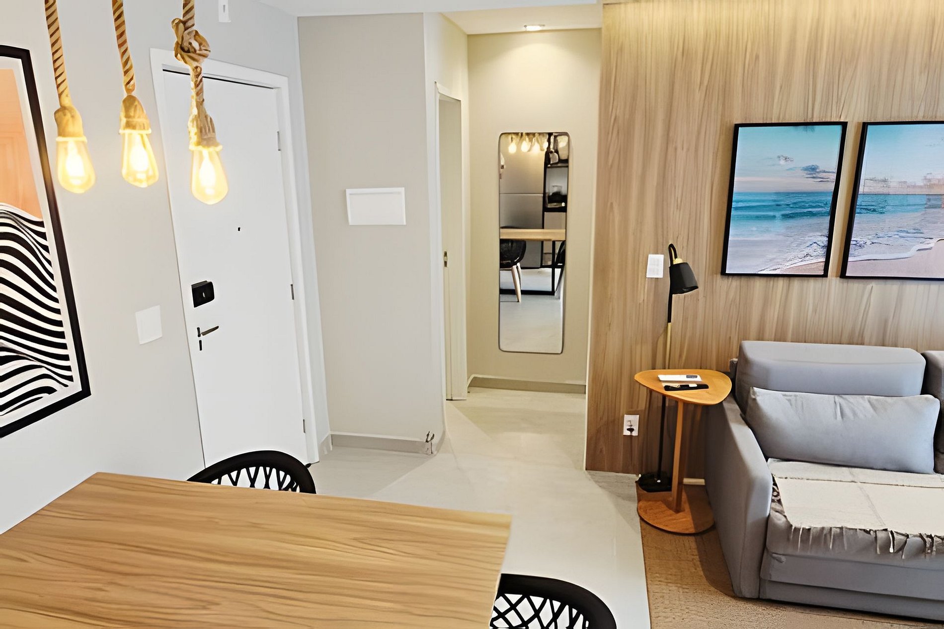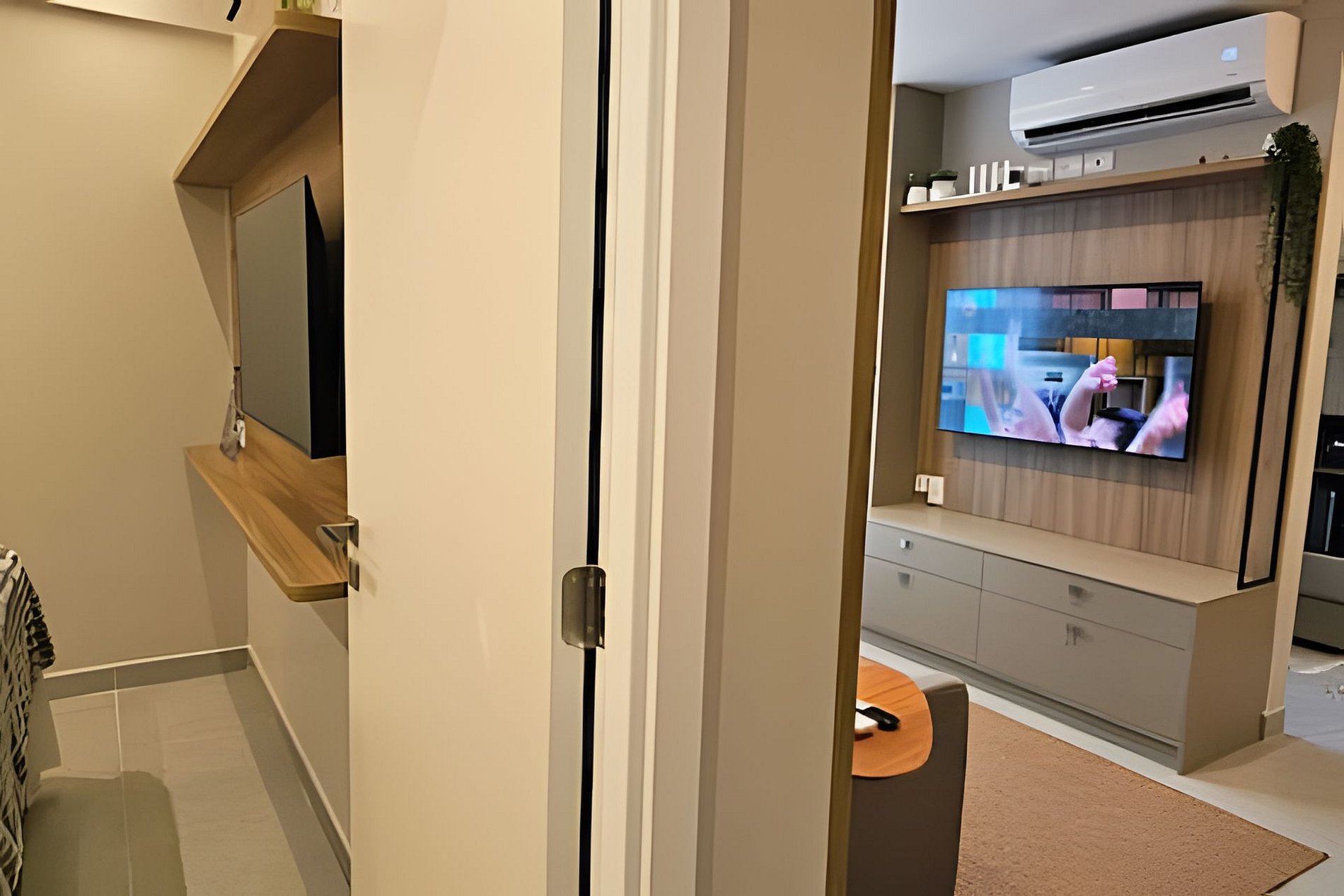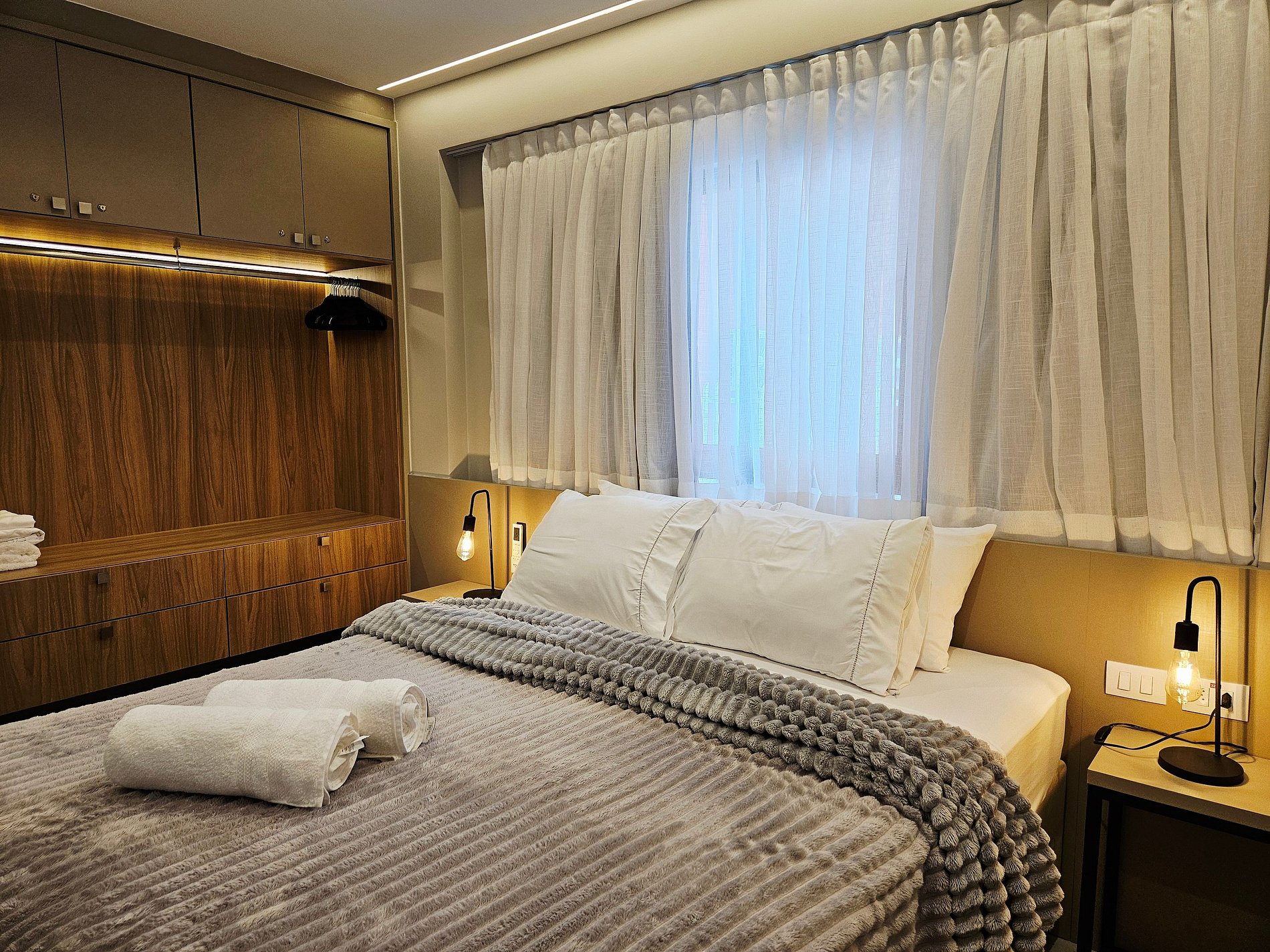 o espaço acomoda até 4 hóspedes com muito conforto: cama queen no quarto + sofá-cama queen premium na sala. Tudo foi planejado para garantir uma estadia leve, organizada e funcional.