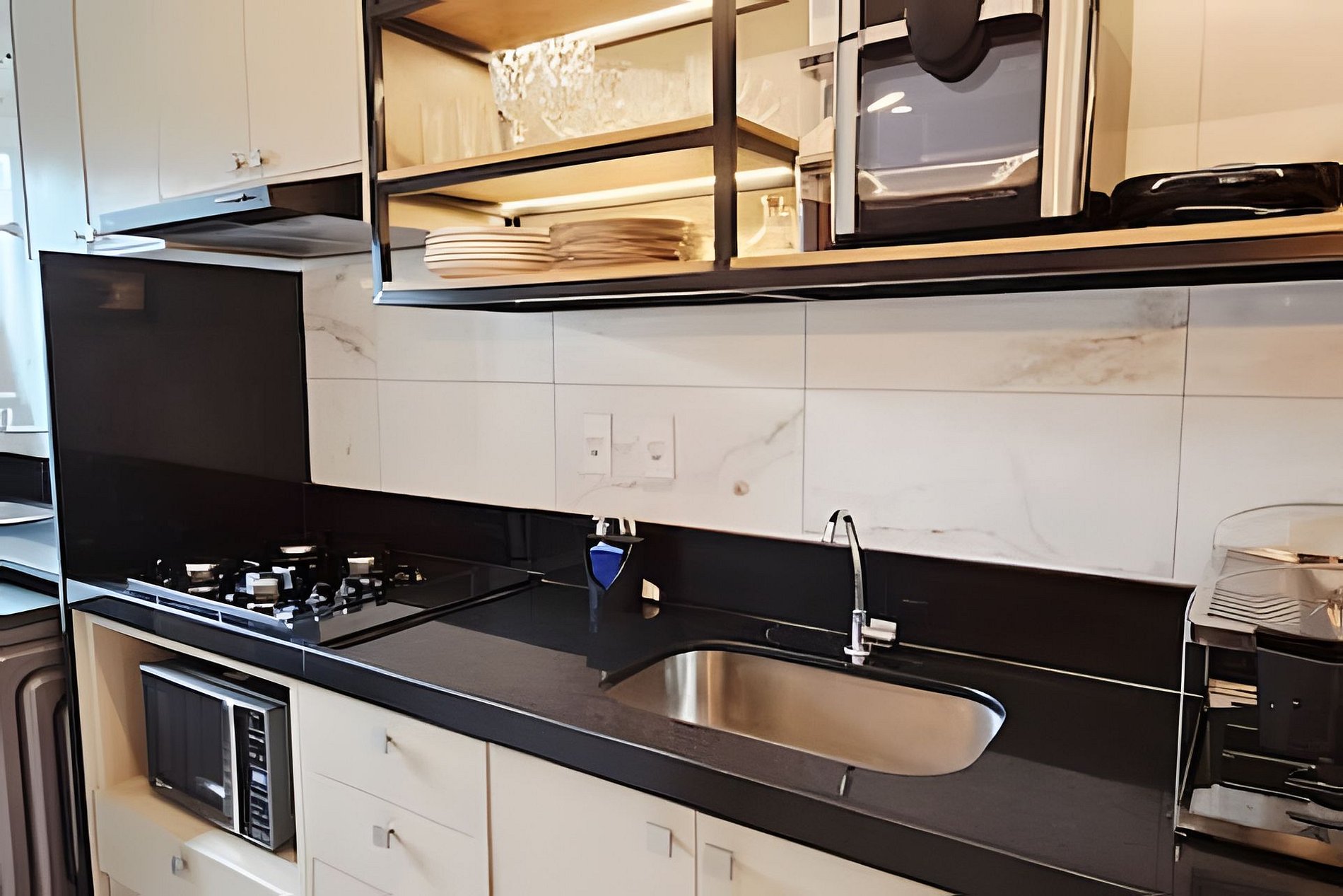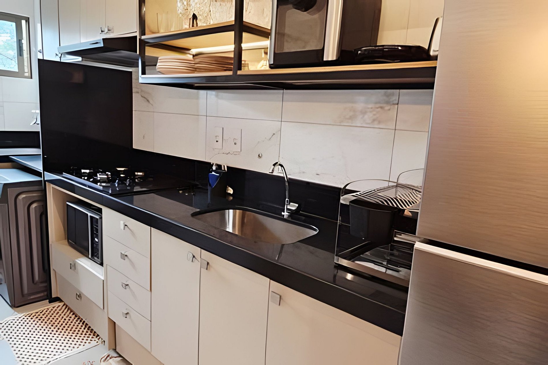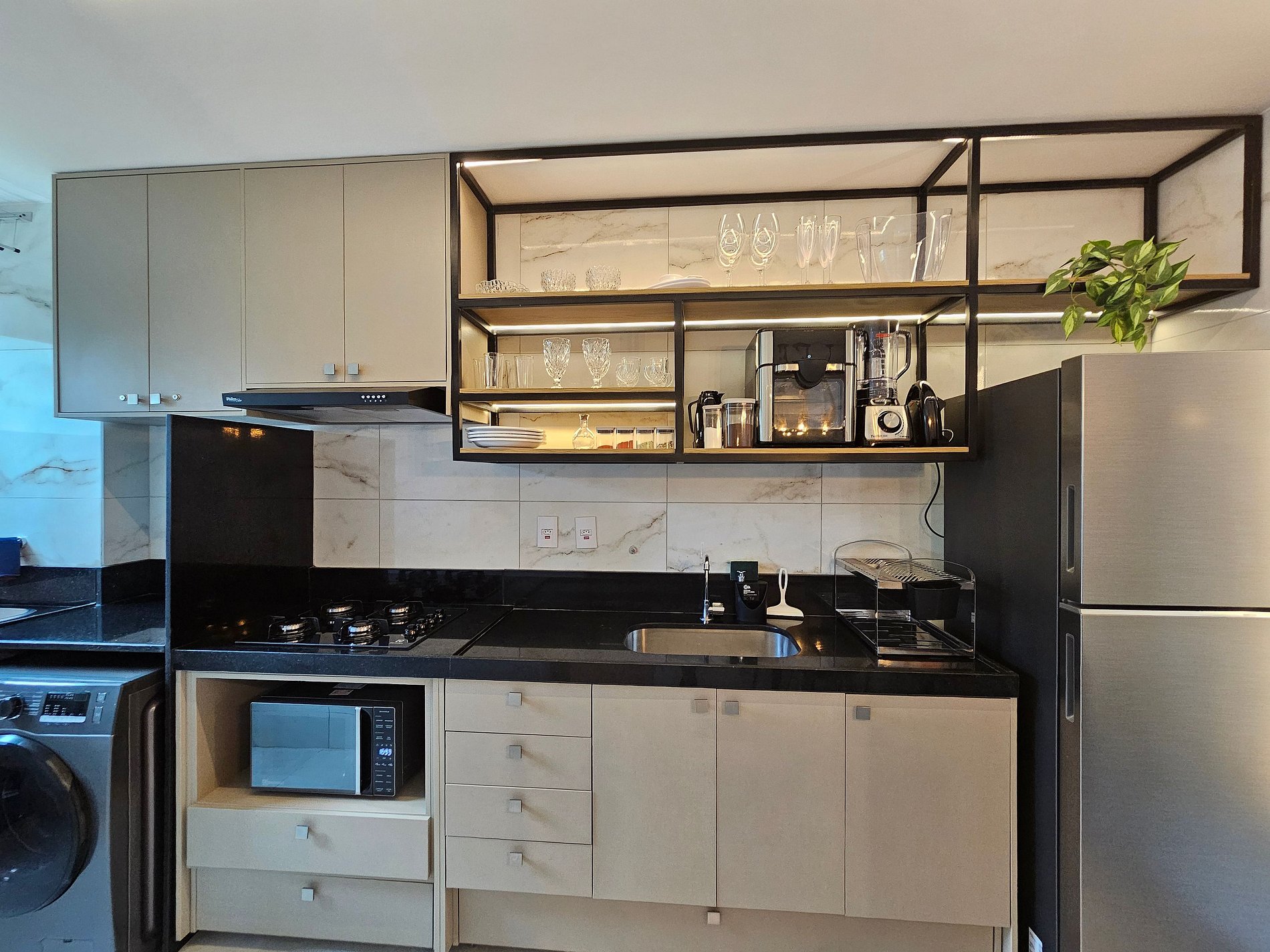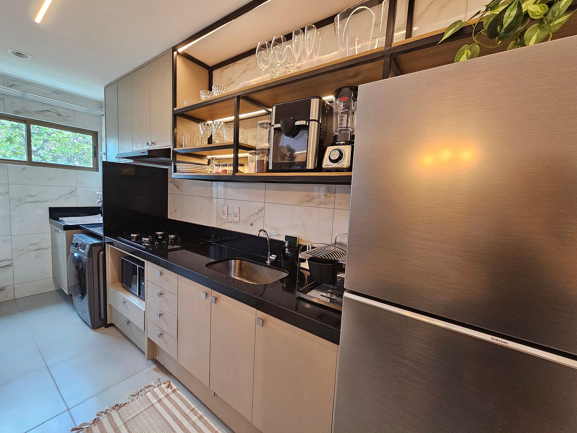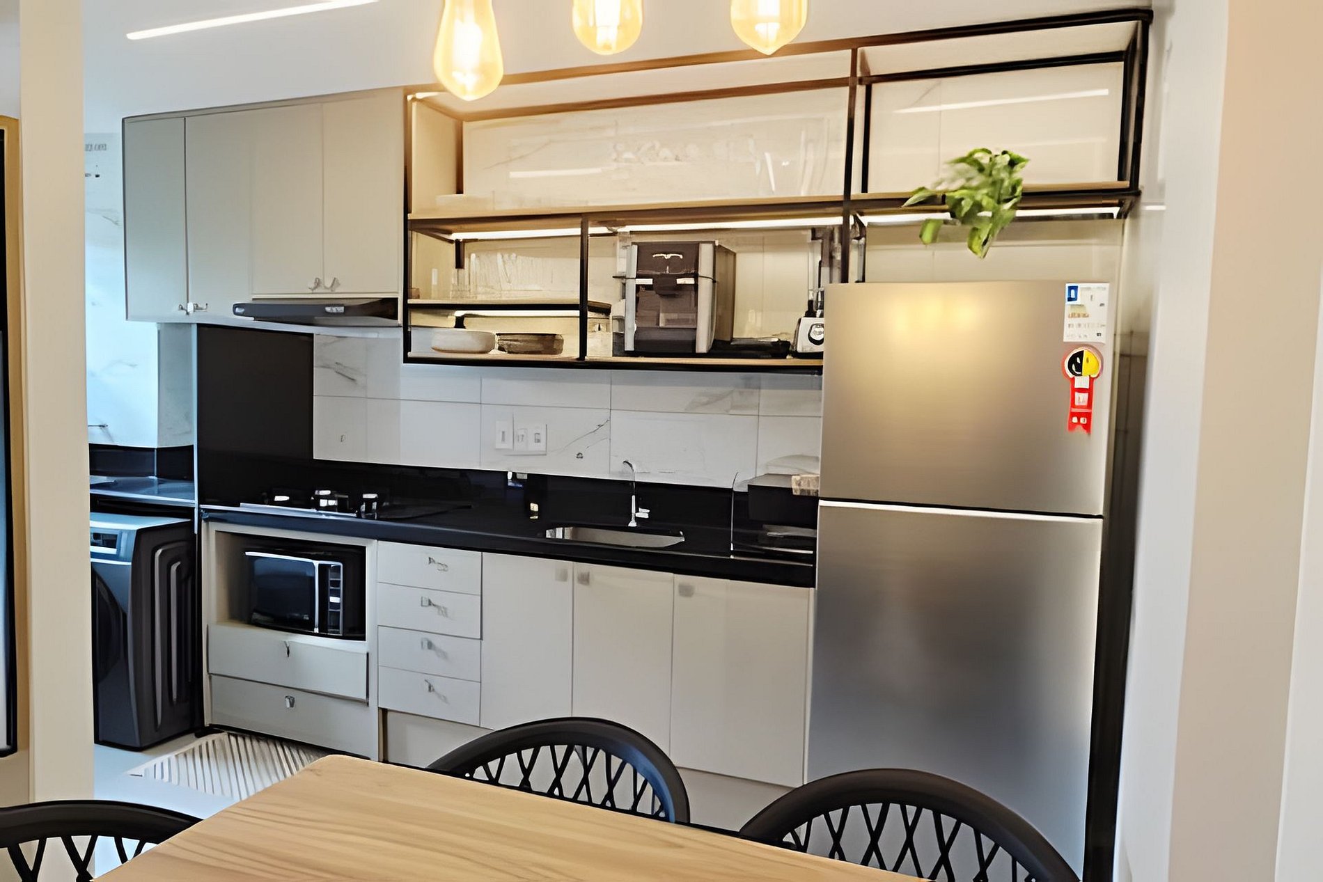 Totalmente equipada para preparar desde lanches até refeições completas. Conta com pratos, talheres, copos, panelas, fogão cooktop a gás 4 bocas, geladeira com freezer separado, airfryer moderna, micro-ondas, sanduicheira e liquidificador. Tudo para facilitar sua rotina.