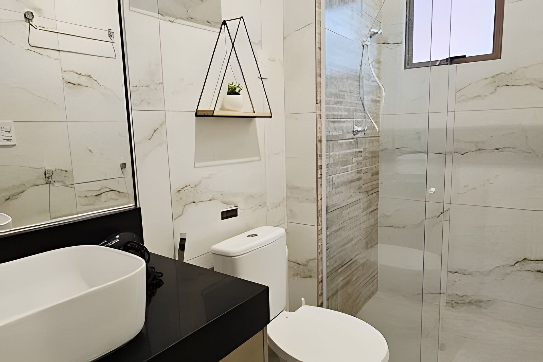 Moderno e completo, com box de vidro, chuveiro com água quente, espelho, secador de cabelos e ferro de passar — pensado para seu conforto diário.