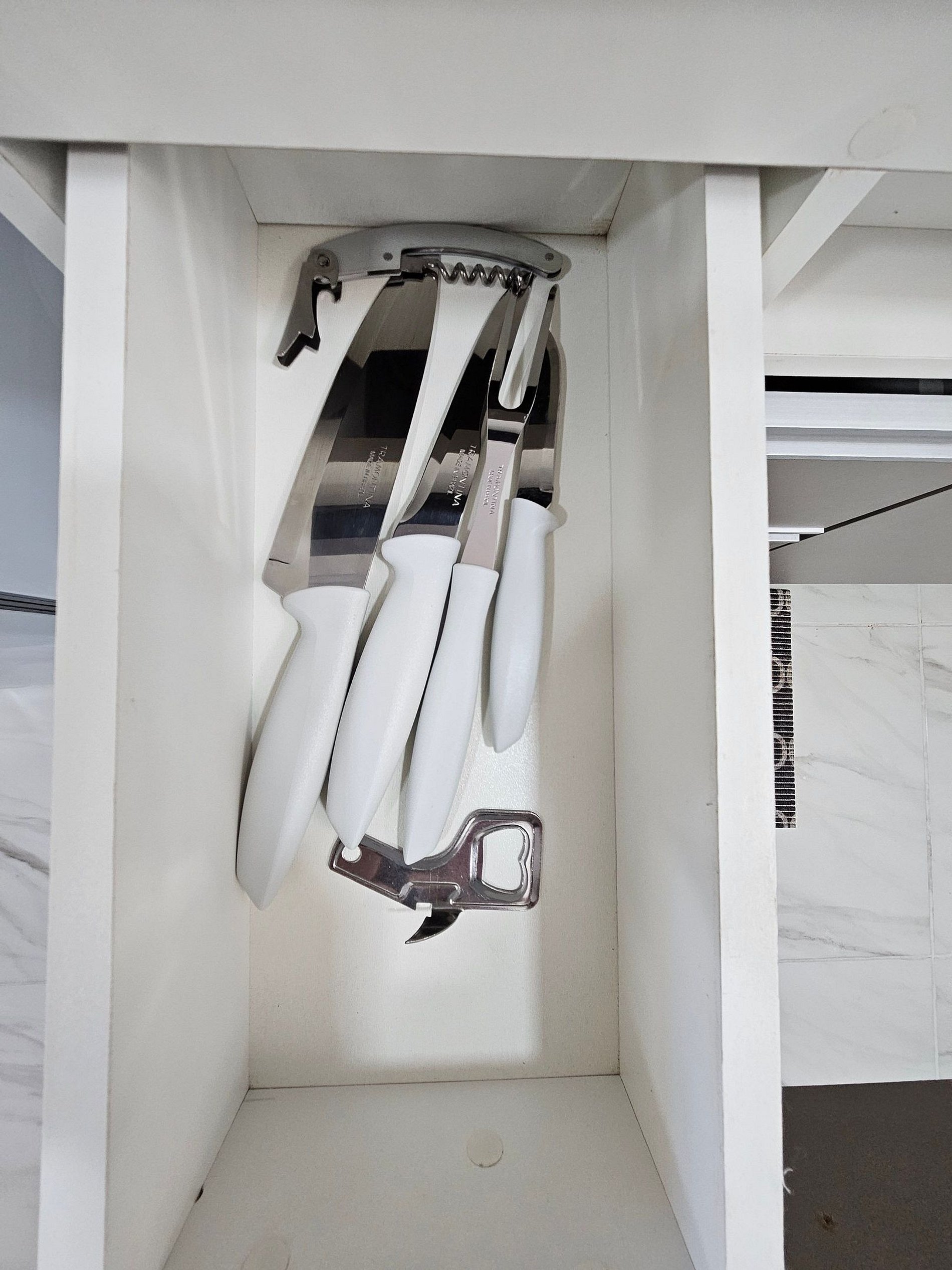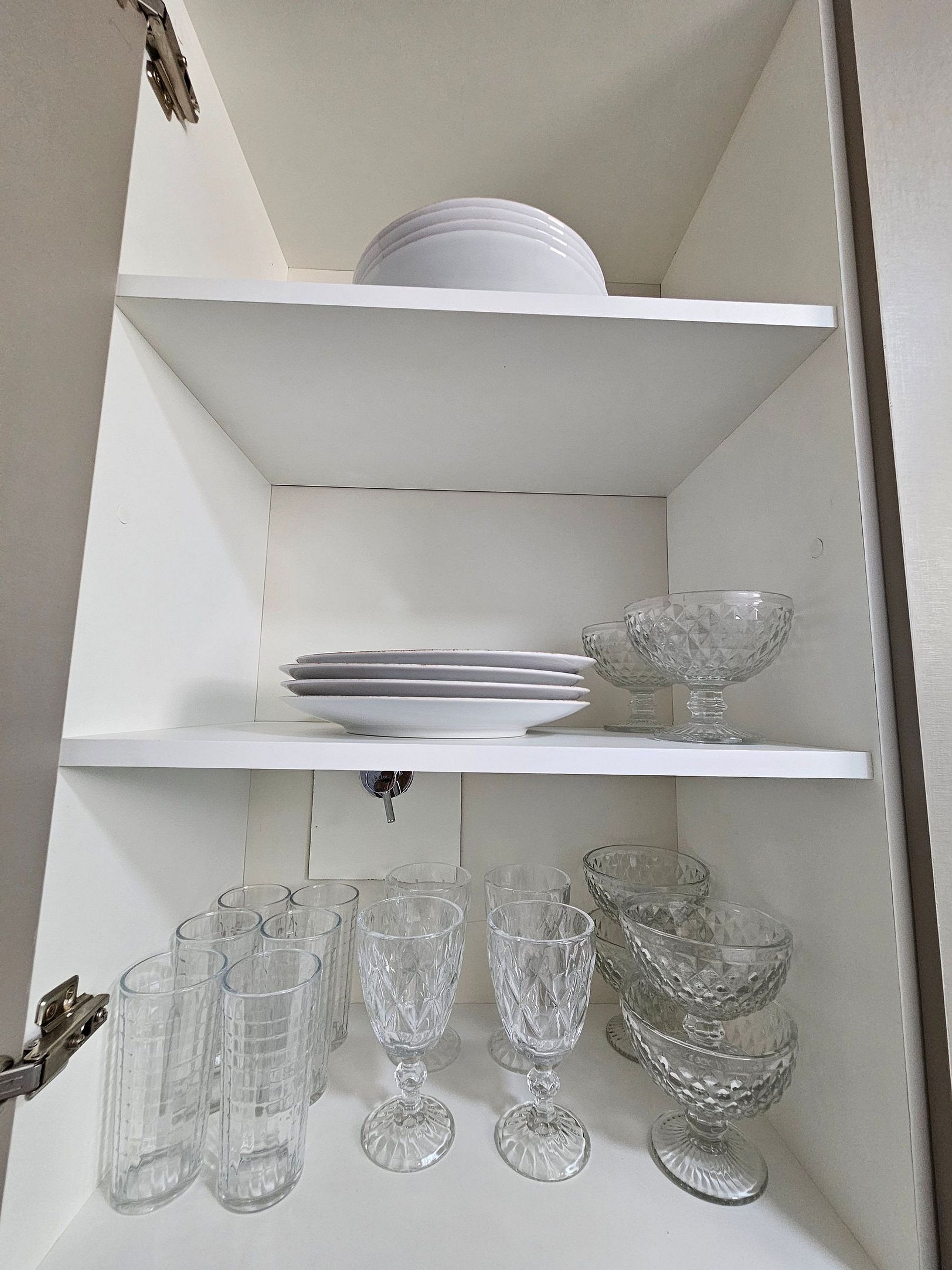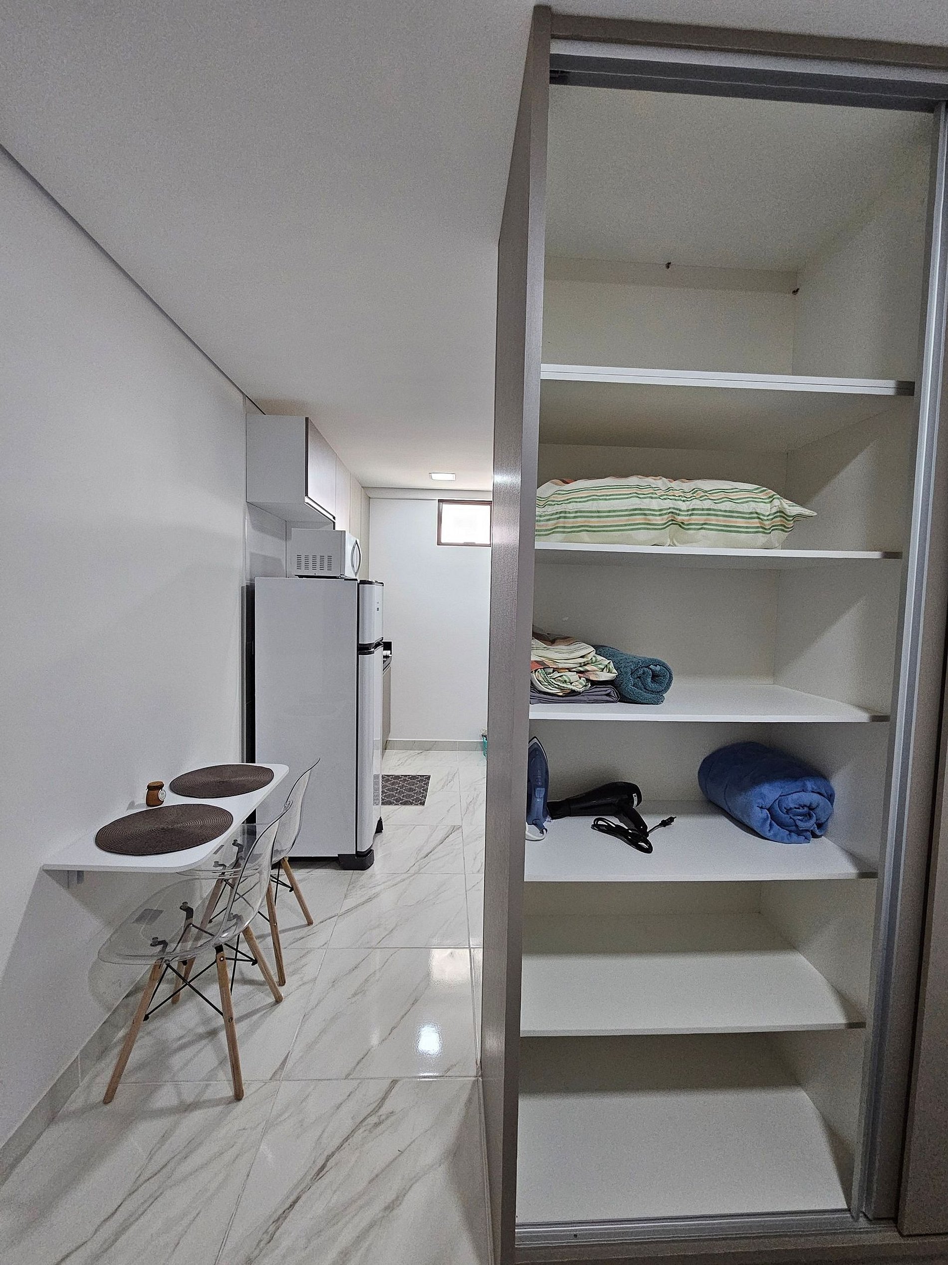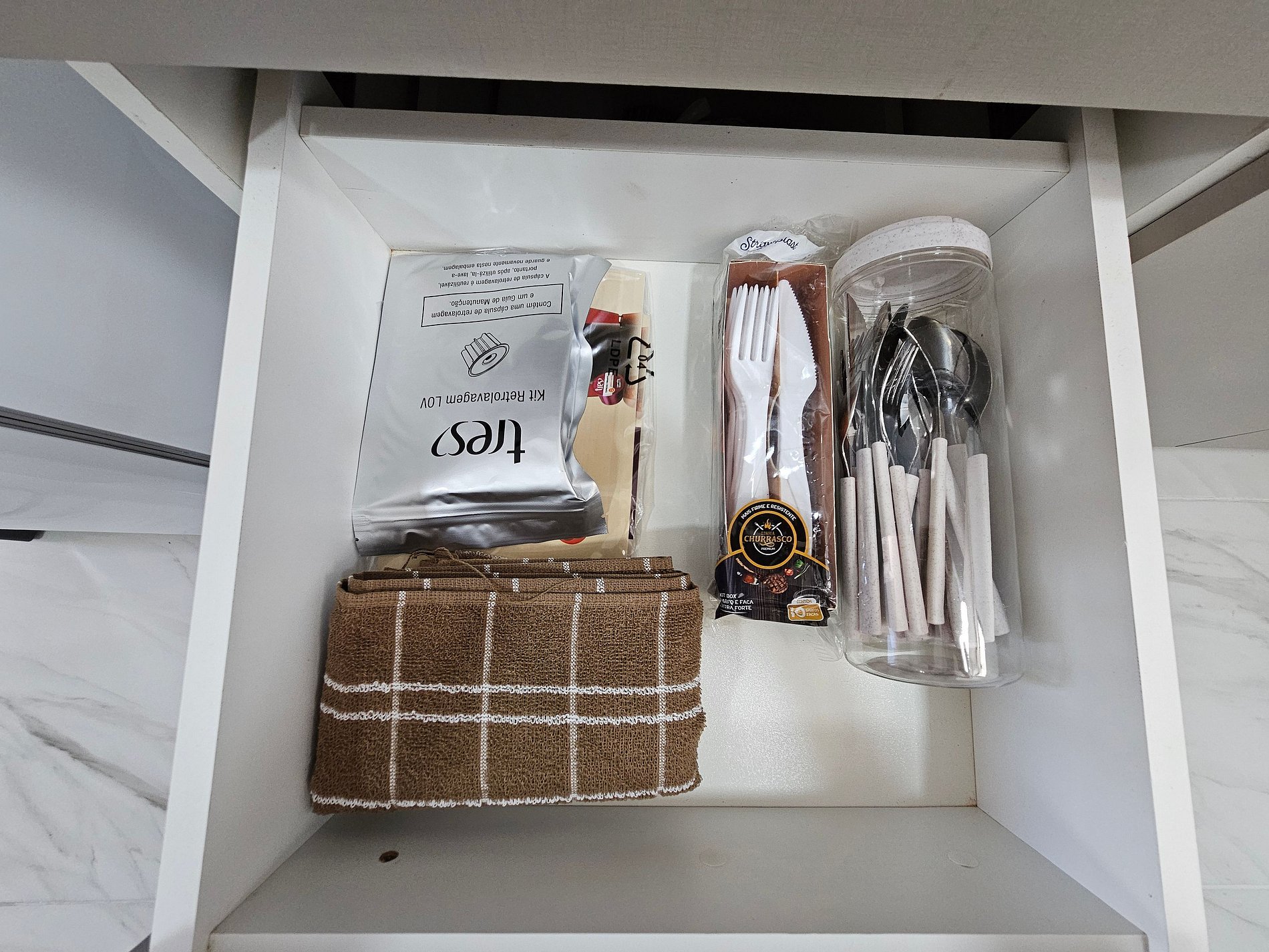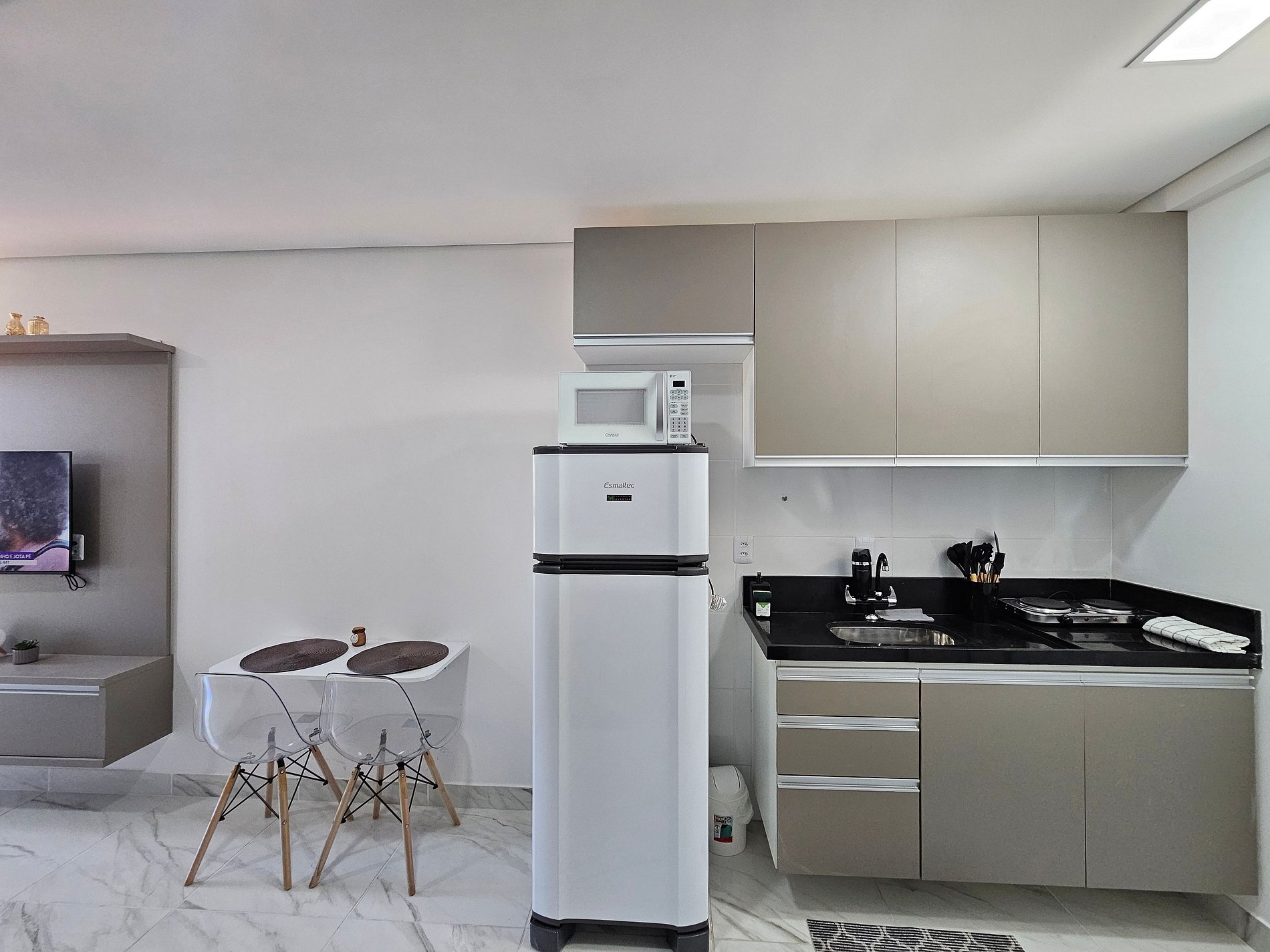 Cozinha compacta e completa • Geladeira com freezer separado • Pia com torneira e filtro de água • Fogão portátil elétrico • Micro-ondas • Air fryer • Liquidificador • Sanduicheira • Louças e utensílios para café e refeições