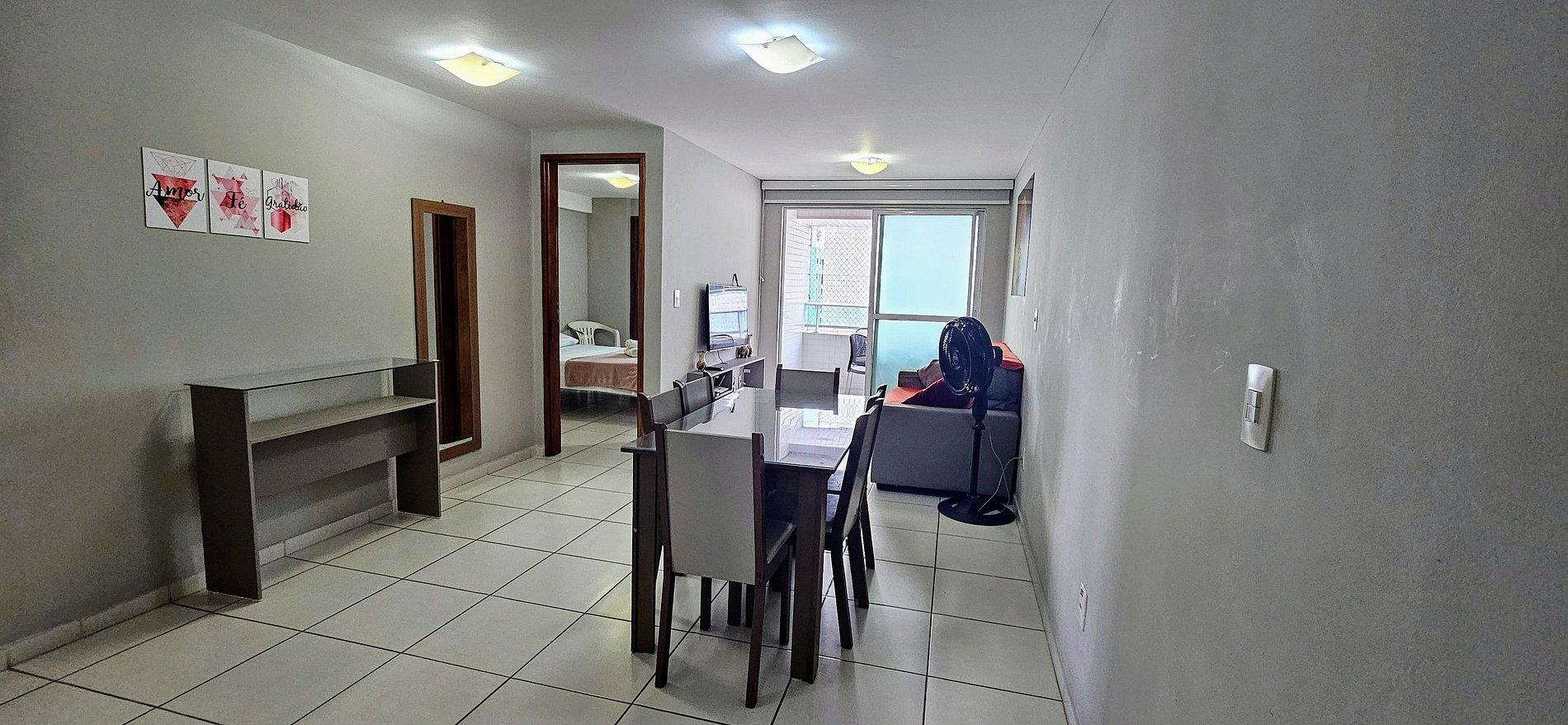 SALA DE ESTAR COM VARANDA: Estante, TV smart, sofá com encosto reclinável, cortina blackout.