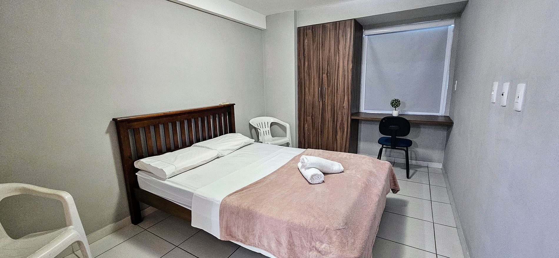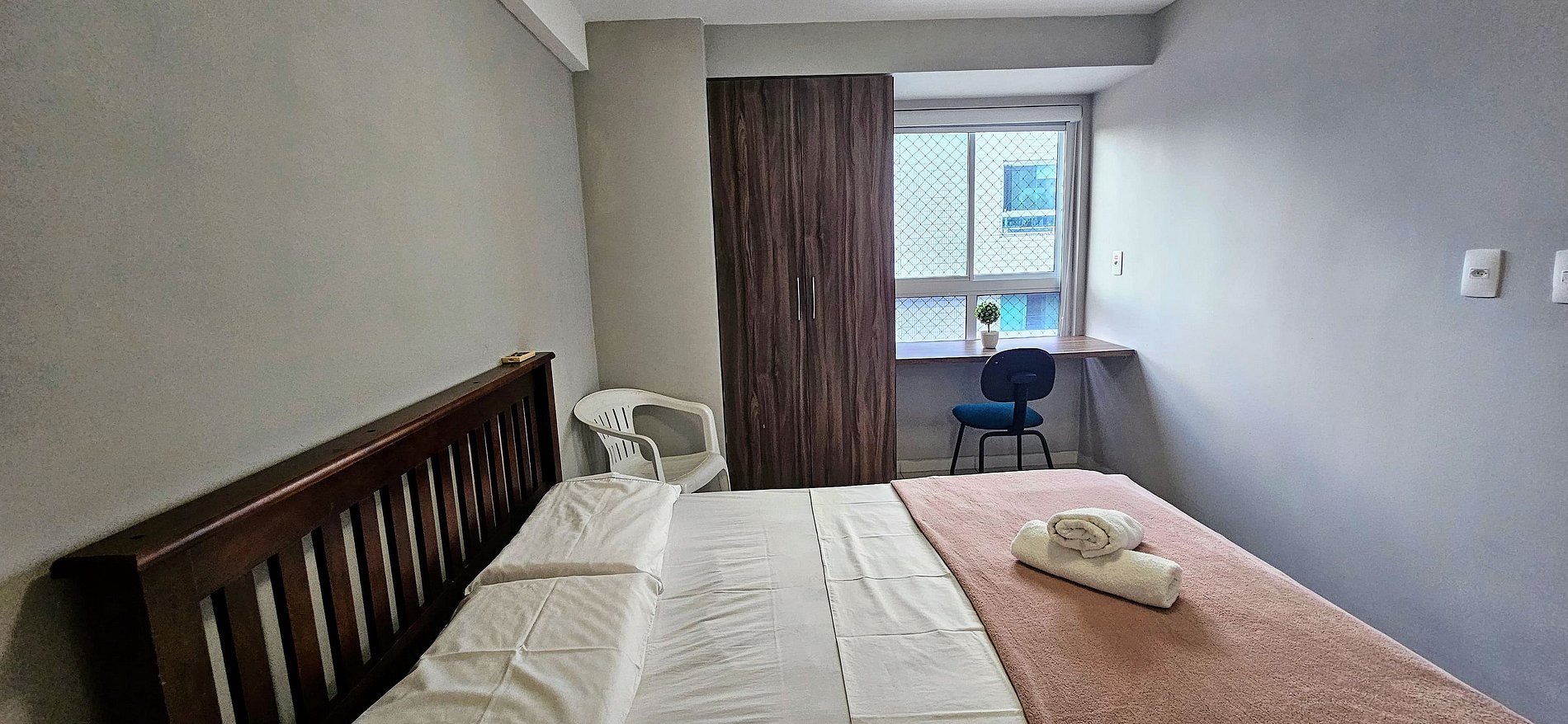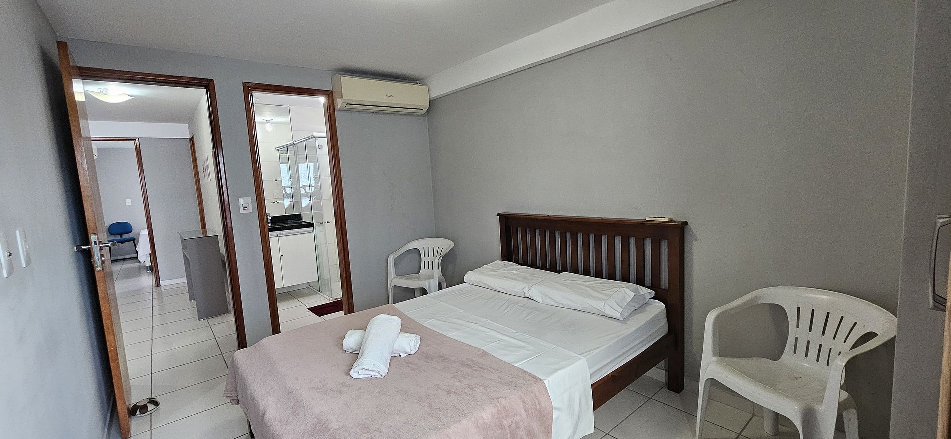 DORMITÓRIO SUÍTE: com cama casal, guarda roupas, mesa auxiliar com cadeira, ar condicionado, ferro de passar roupas e cortina blackout.