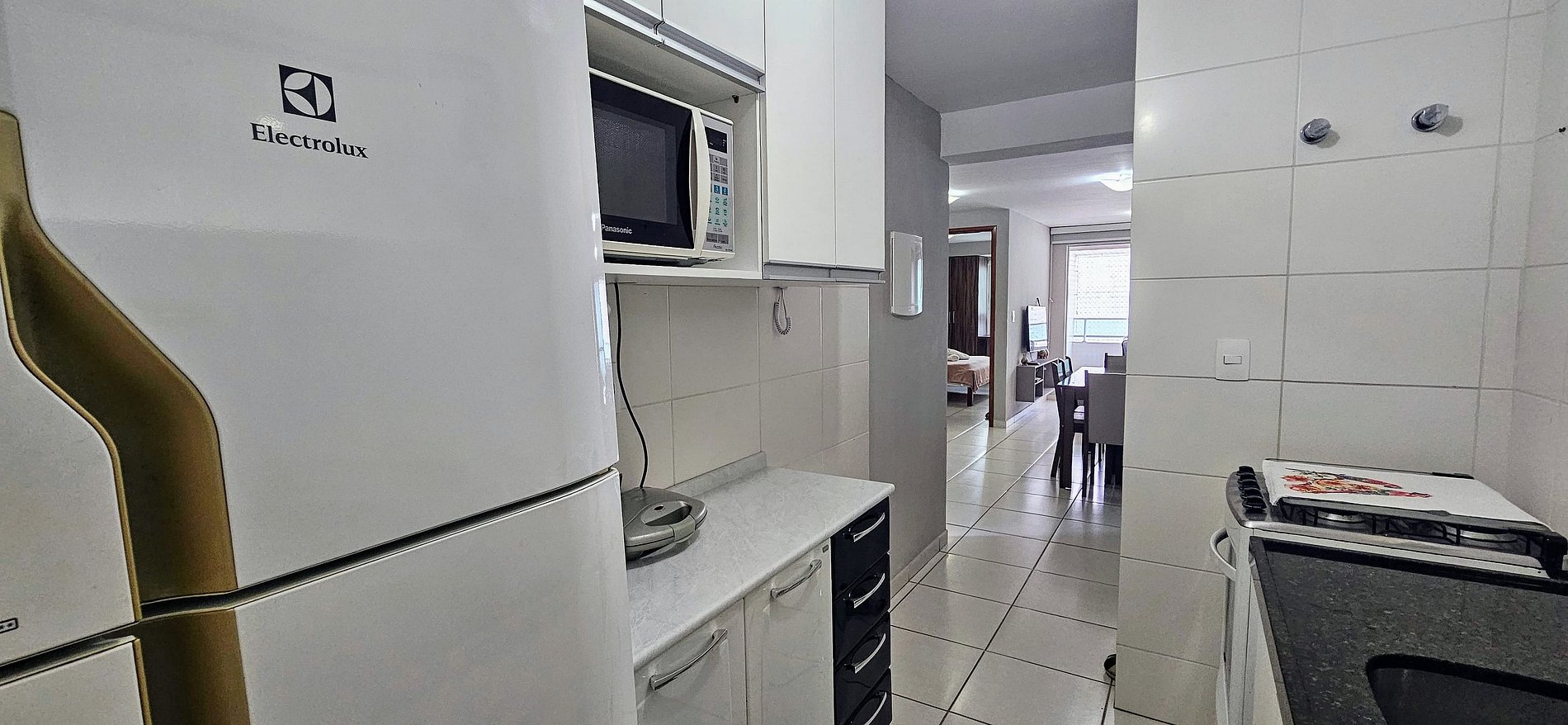 COZINHA: Geladeira com freezer, fogão a gás com forno, forno microondas, sanduicheira, liquidificador, panelas, cuscuzeira, coador para café, pratos, talheres dentre outros utensílios para o preparo de refeições.