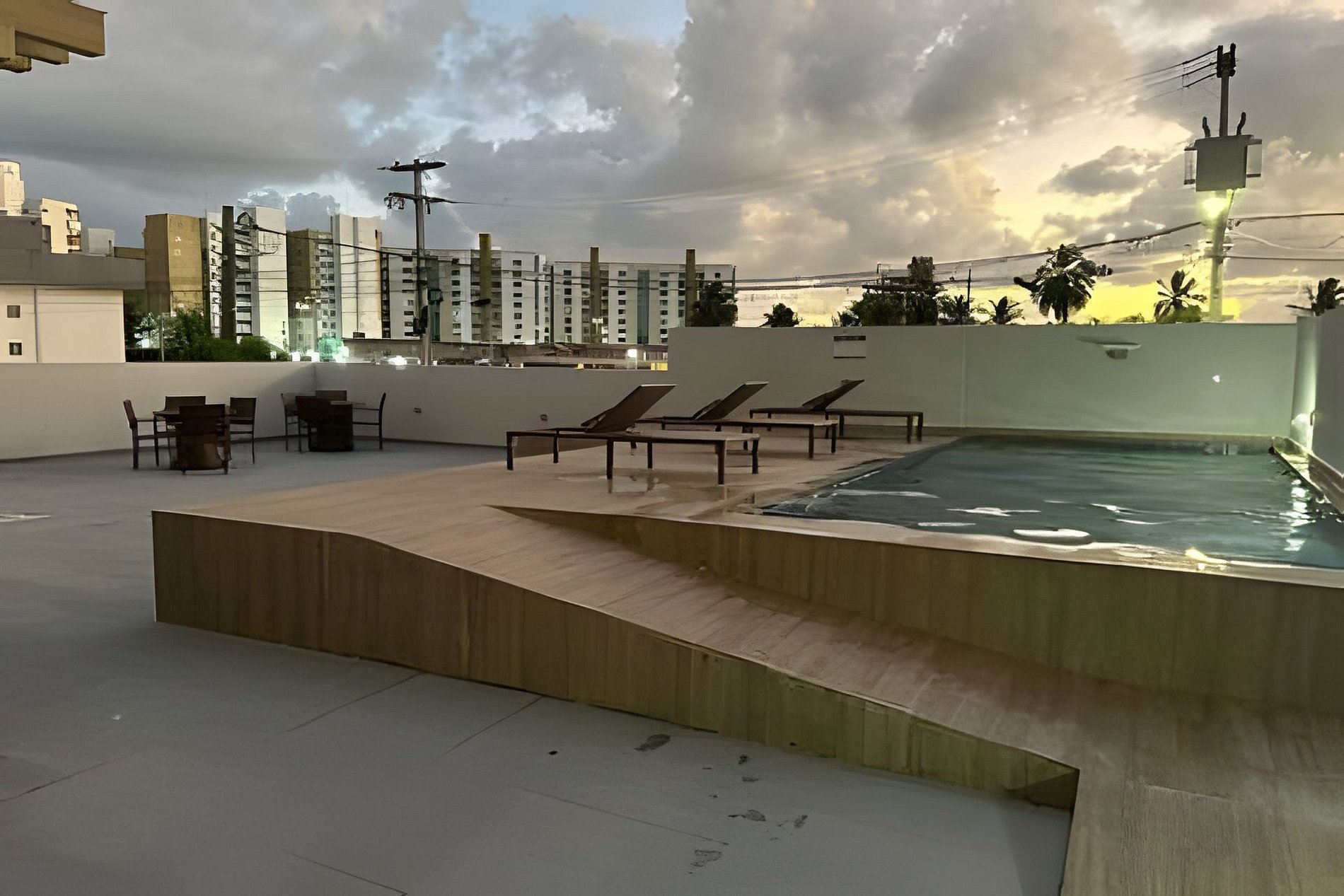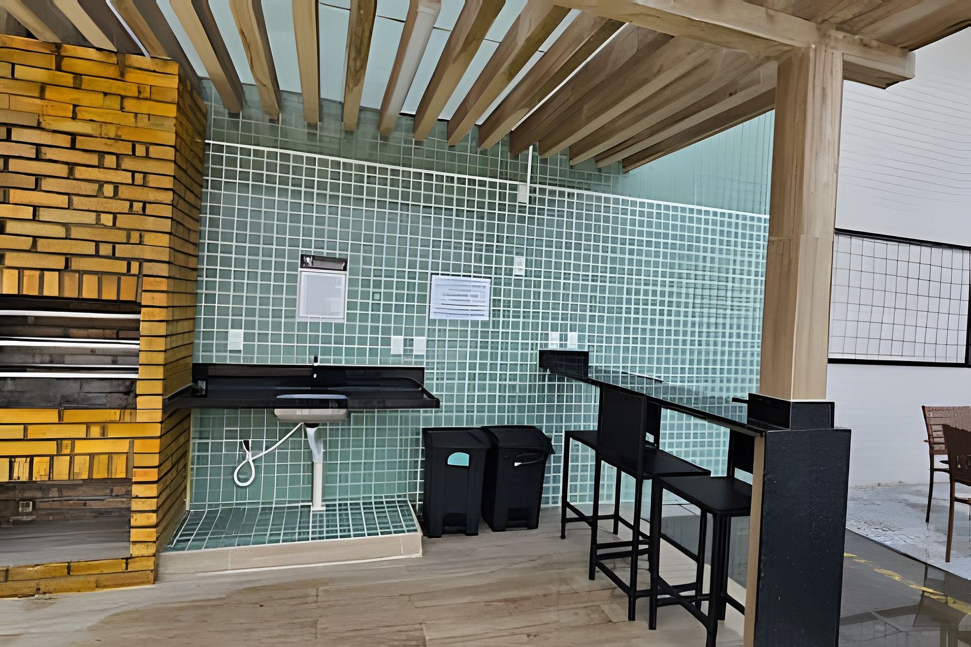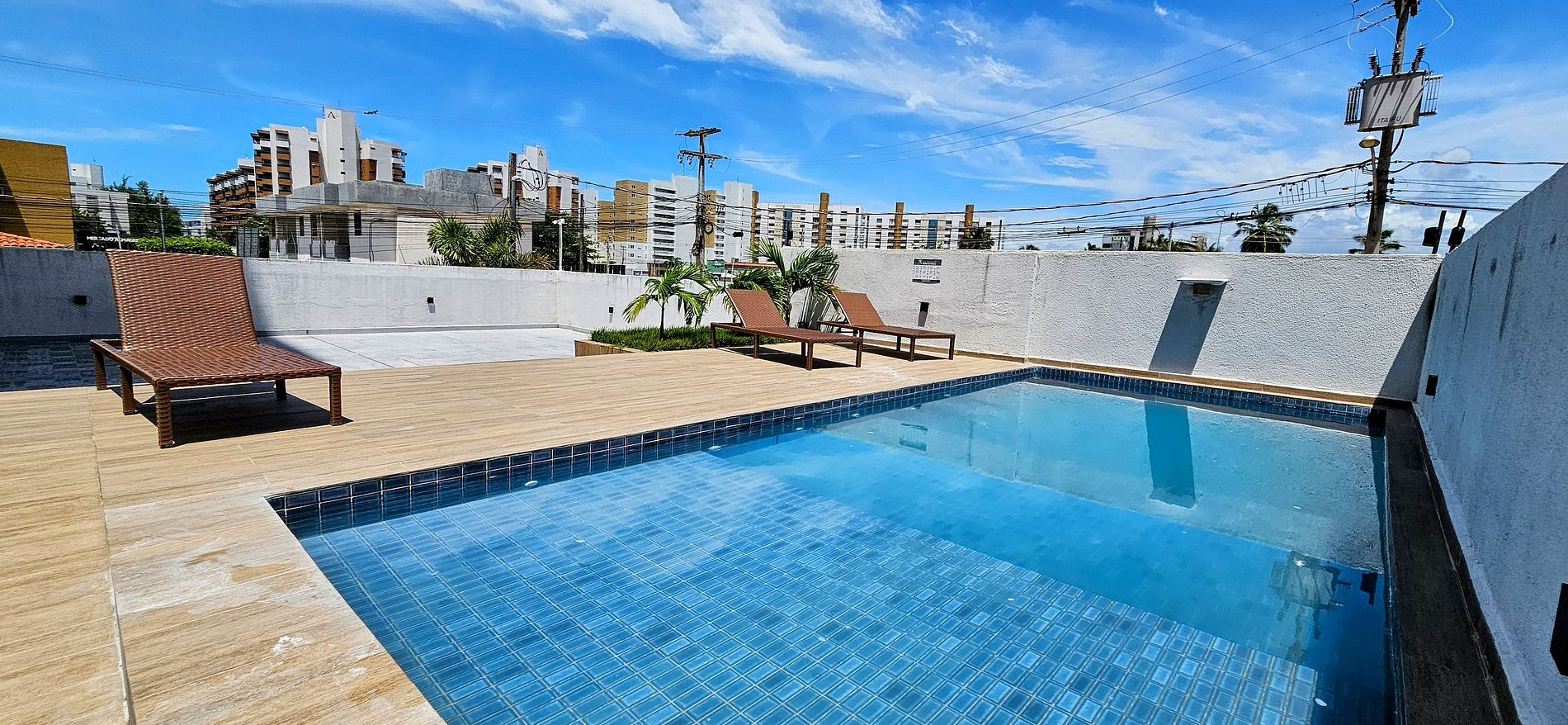 LAZER: está disponível uma refrescante piscina com espreguiçadeiras, churrasqueira com mesa e cadeiras, quadra poliesportiva e um terraço no último andar com vista panorâmica do mar e pôr do Sol do Jacaré.