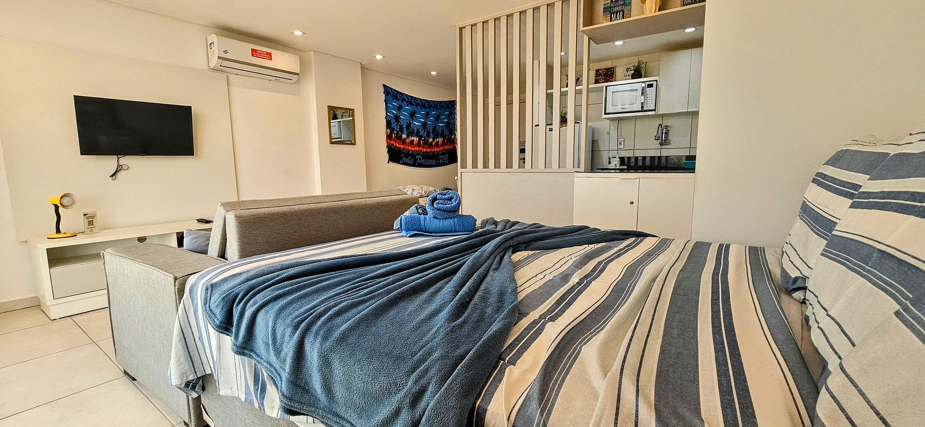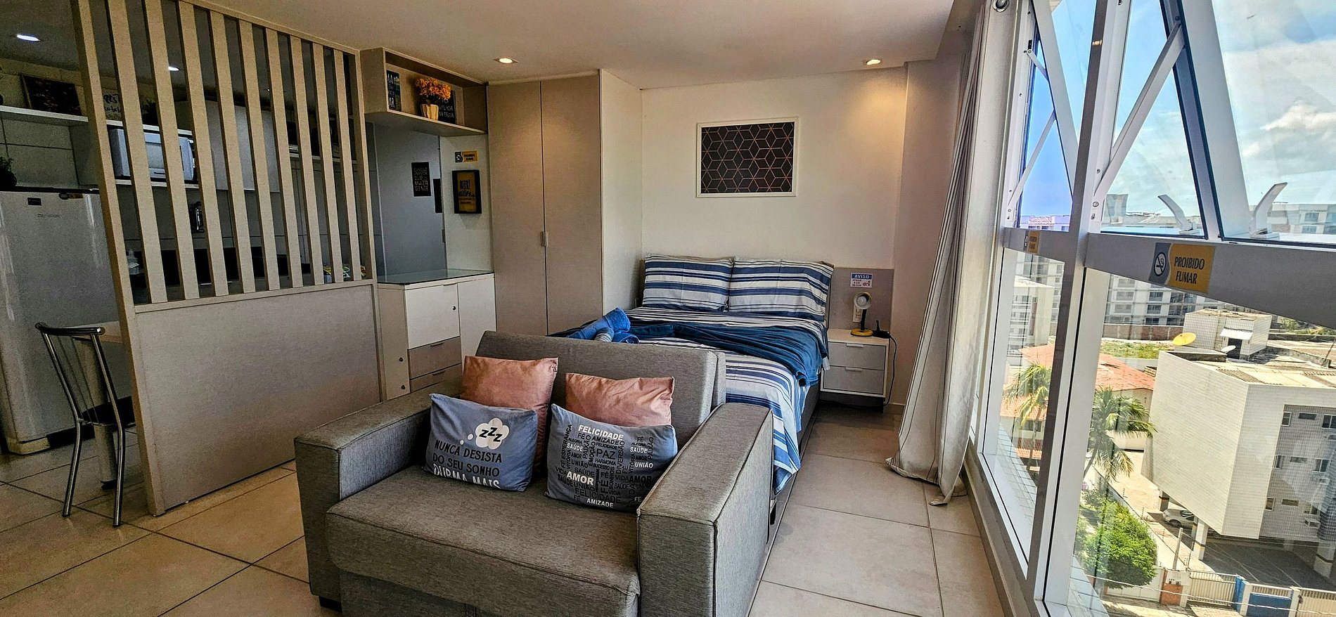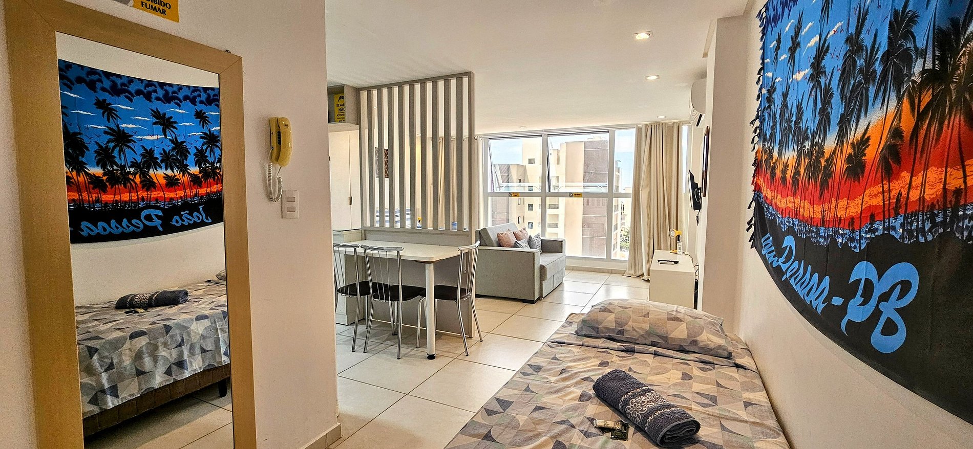 Studio completo, vista deslumbrante em Ponta de Campina! Desfrute de um espaço acolhedor, com uma vista incrível da praia mais charmosa da região metropolitana de João Pessoa/PB! O Studio de 35m² é amplo, totalmente equipado para garantir seu conforto. Ideal a quem busca descanso e praticidade. A localização é imbatível: a poucos metros do mar, do GetMall (com mercado, farmácia e restaurantes) e do famoso Lovina Beach Club. Relaxe nas águas calmas e rasas na maré baixa ou se aventure no kitesurf