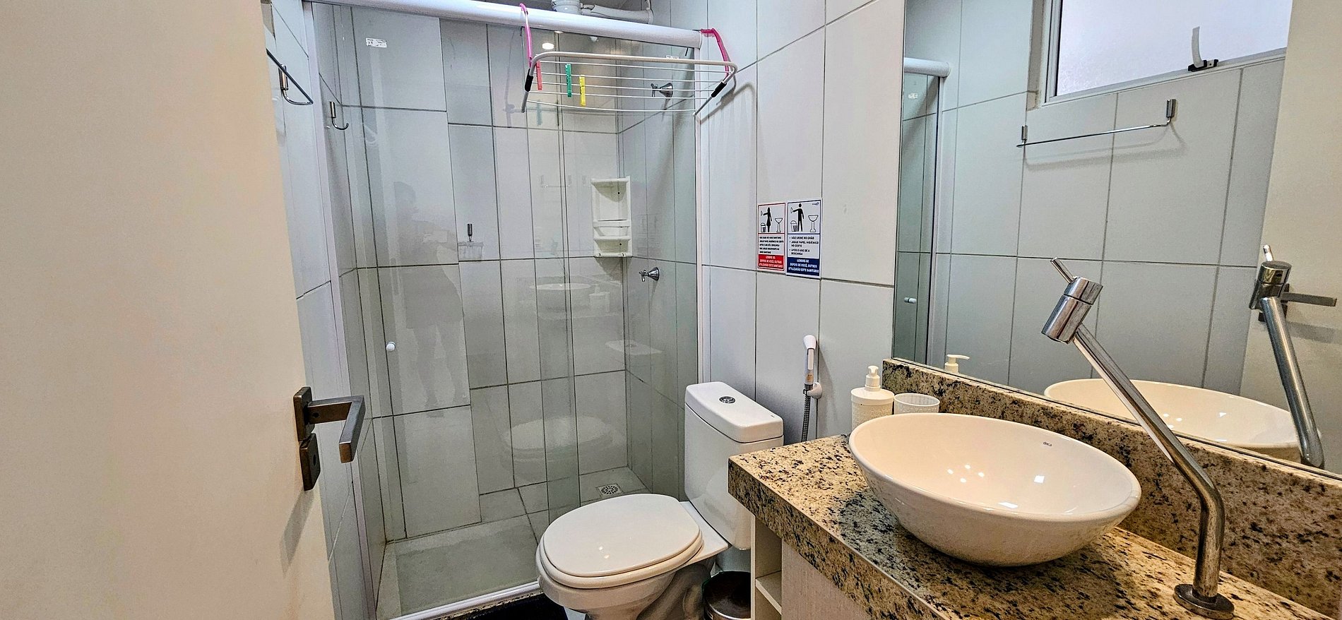 BANHEIRO: box em vidro, ducha higiênica, varal e secador de cabelos.