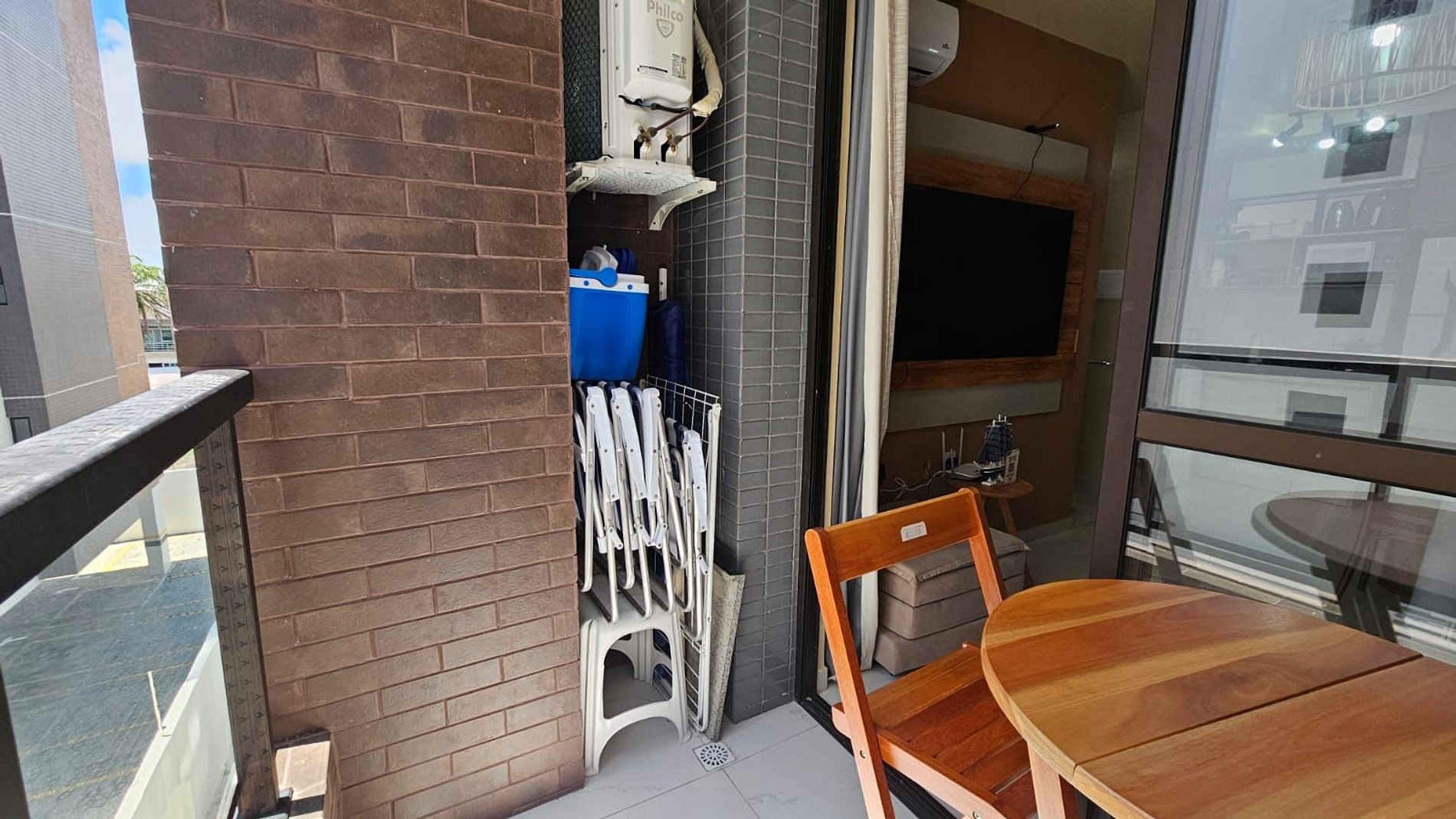 VARANDA: Mesa com 2 cadeiras, cadeiras de praia, cooler, guarda sol e varal.