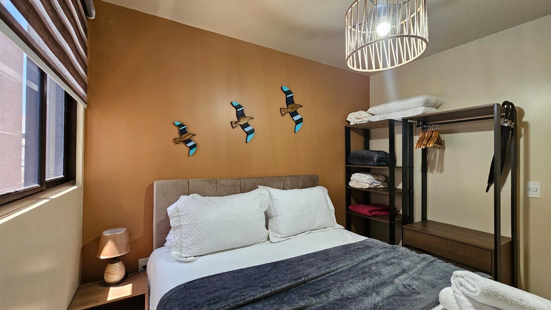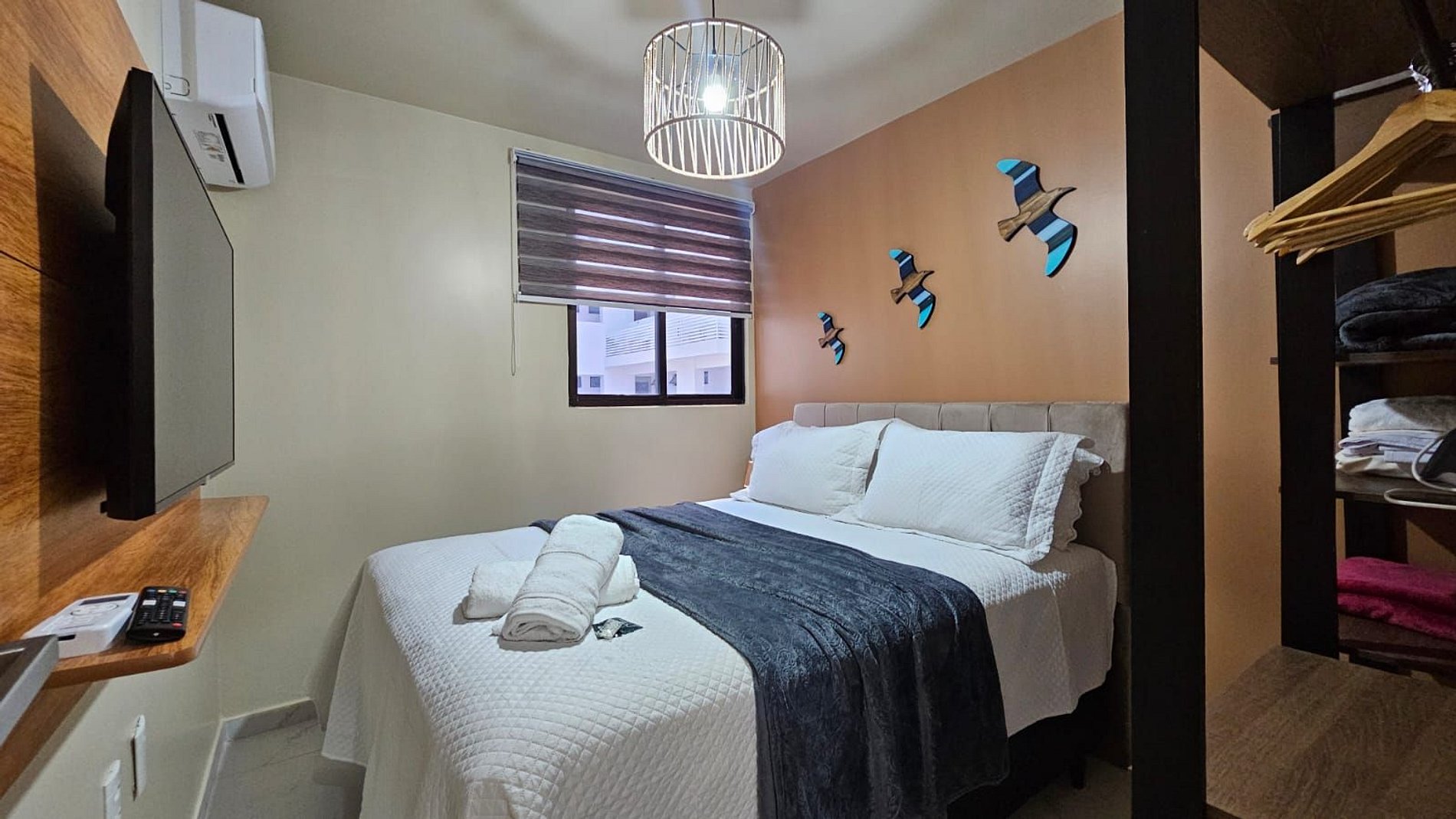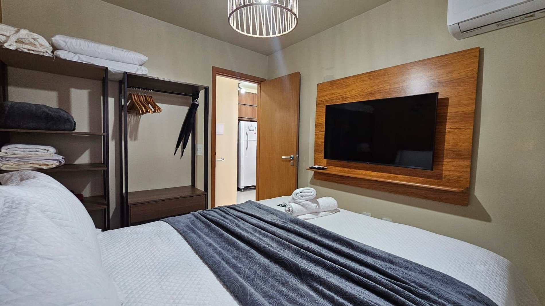 DORMITÓRIO: Cama queen, TV Smart com canais abertos, armário para roupas, cortina romana, mesa de cabeceira, abajur, ar condicionado.