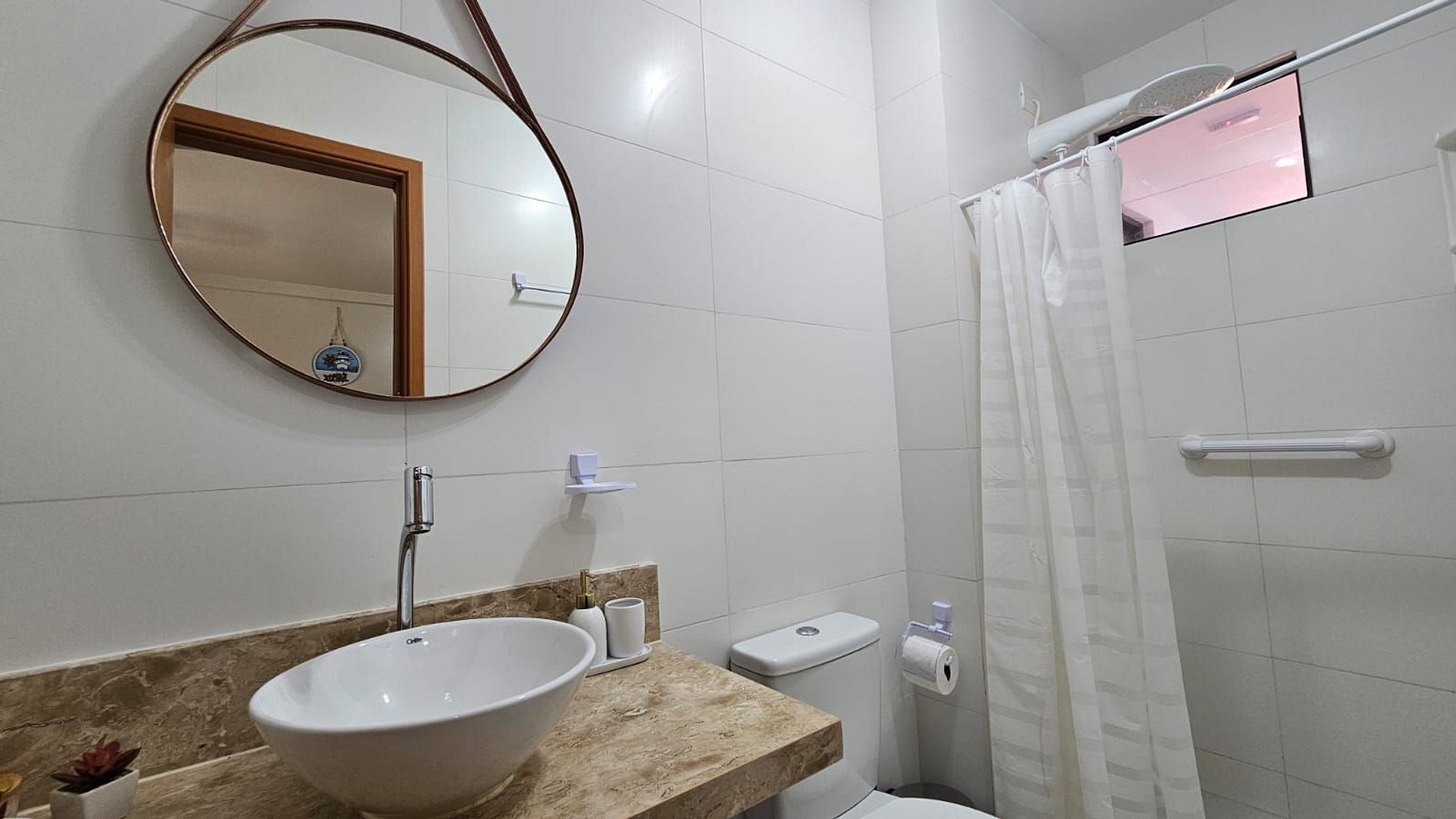 BANHEIRO: Espelho, água quente, barras de apoio.
