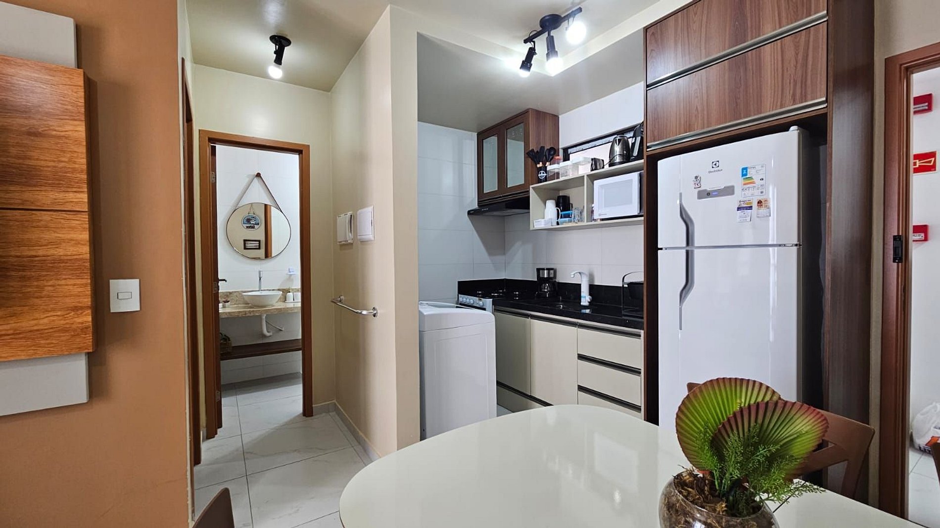 COZINHA: Mesa com 4 cadeiras, geladeria com freezer separado, fogão 4 queimadores com forno, air fryer, sanduicheira grill, jarra elétrica, liquidificador, forno microondas, cafeteira, louças, panelas, xícaras, copos, taças e todos os demais itens para o preparo de refeições. Máquina de lavar roupas.