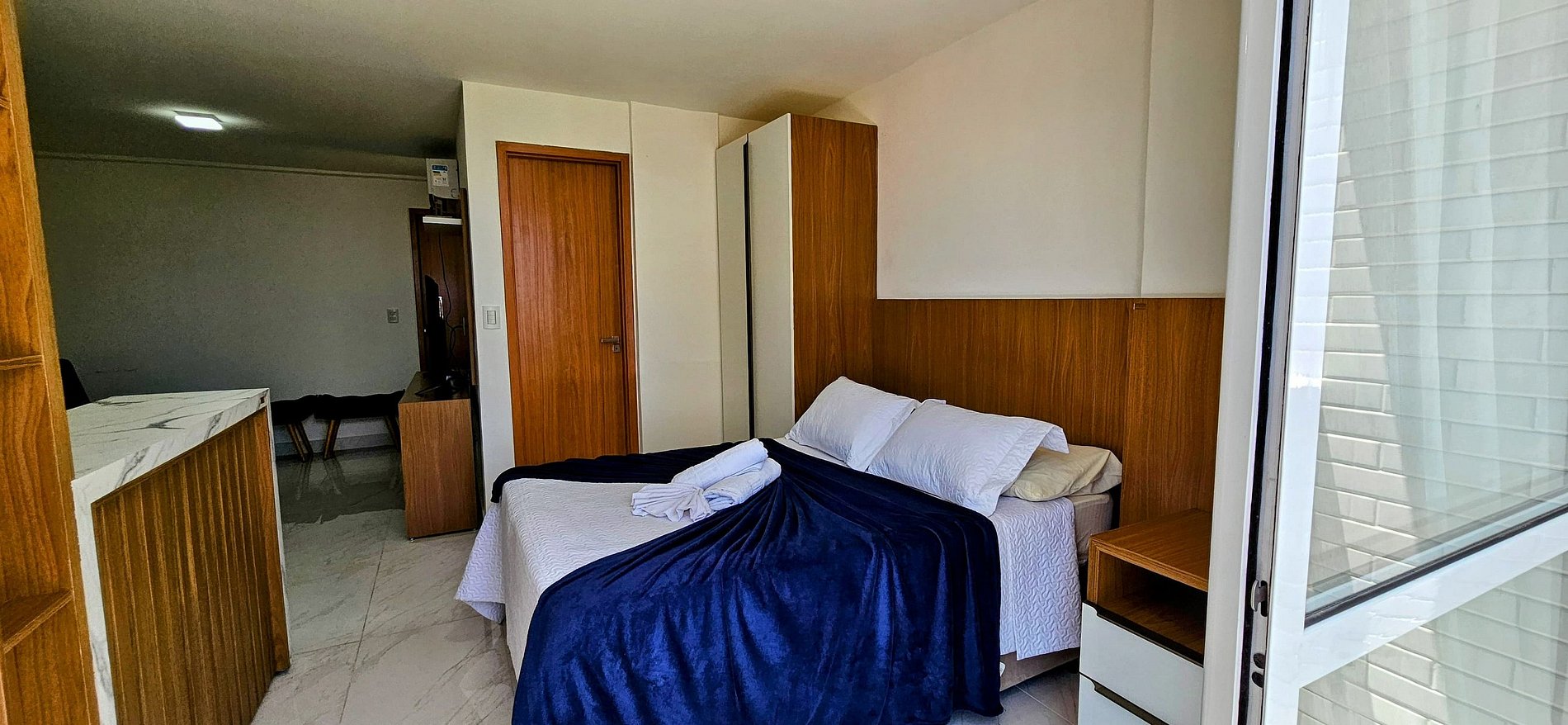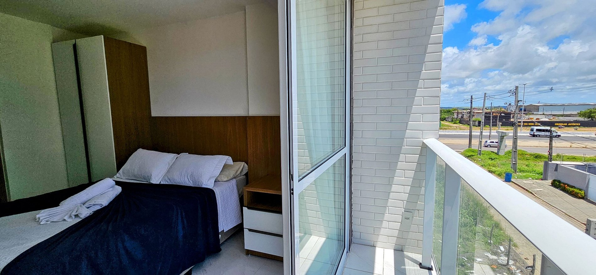QUARTO COM VARANDA ABERTA: cama box baú casal, guarda roupas com cabides e mesa de cabeceira com gavetas, cortina blackout.