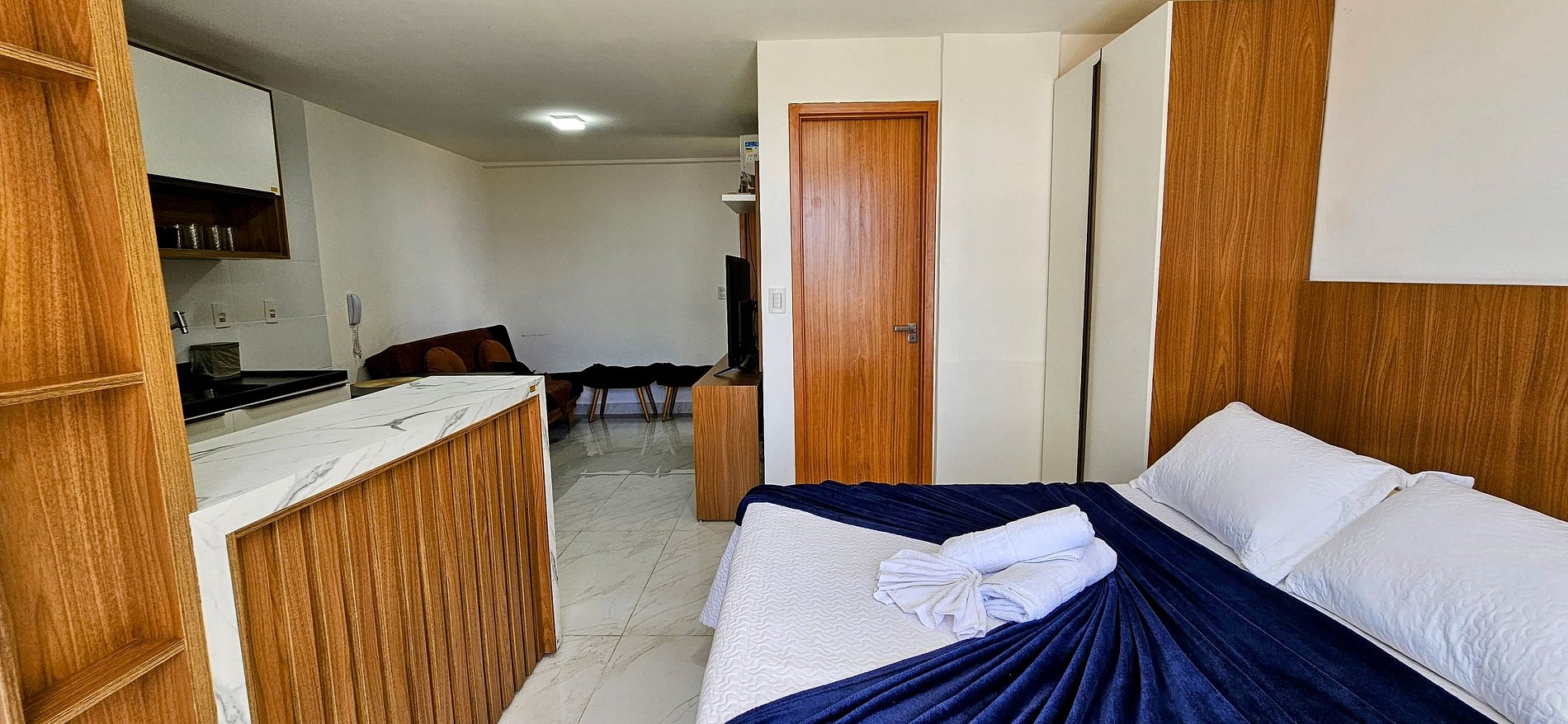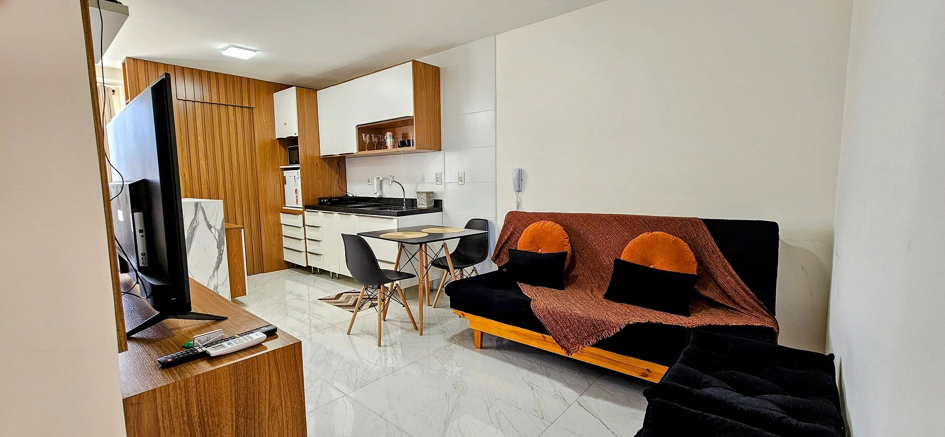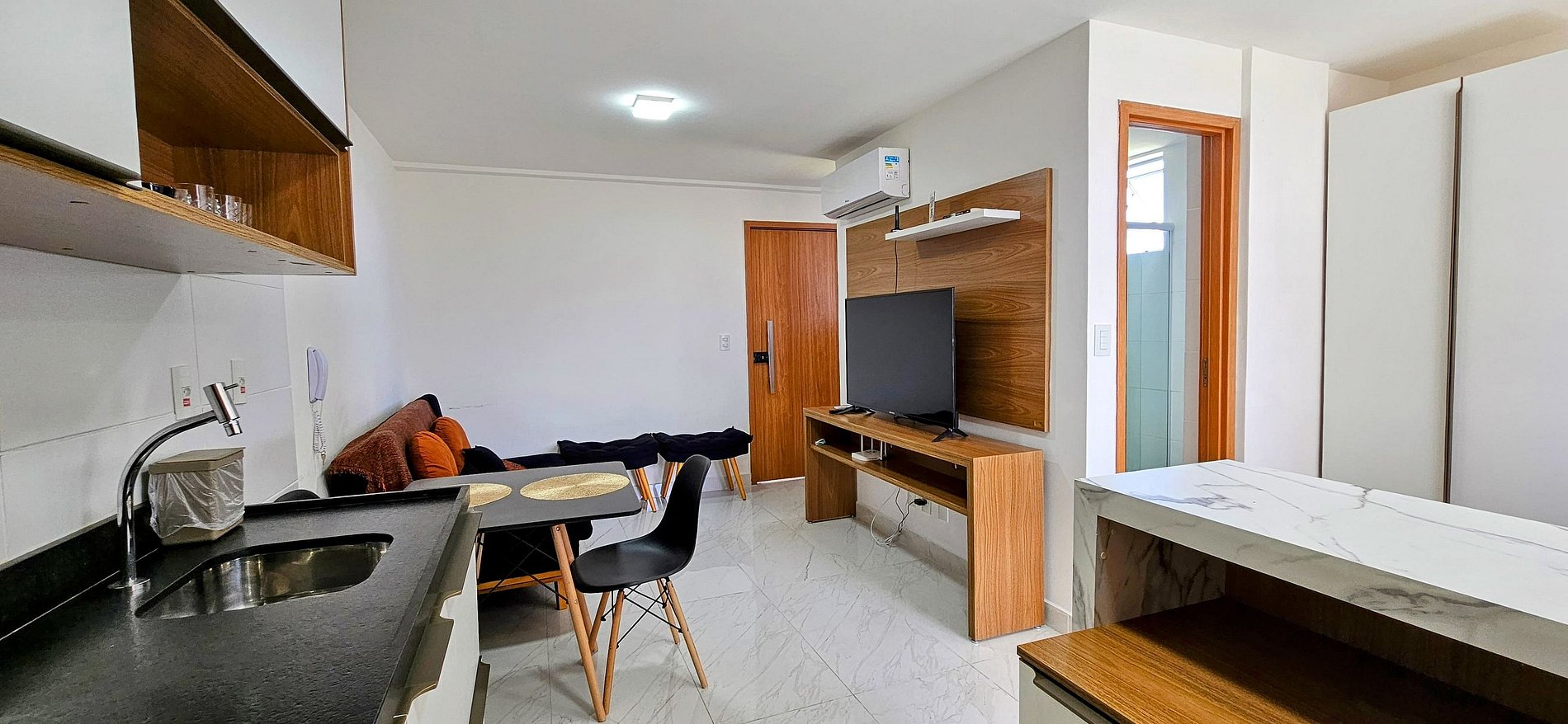 SALA: sofá cama casal, 2 banquetas, TV Smart 49 polegadas e ar condicionado.