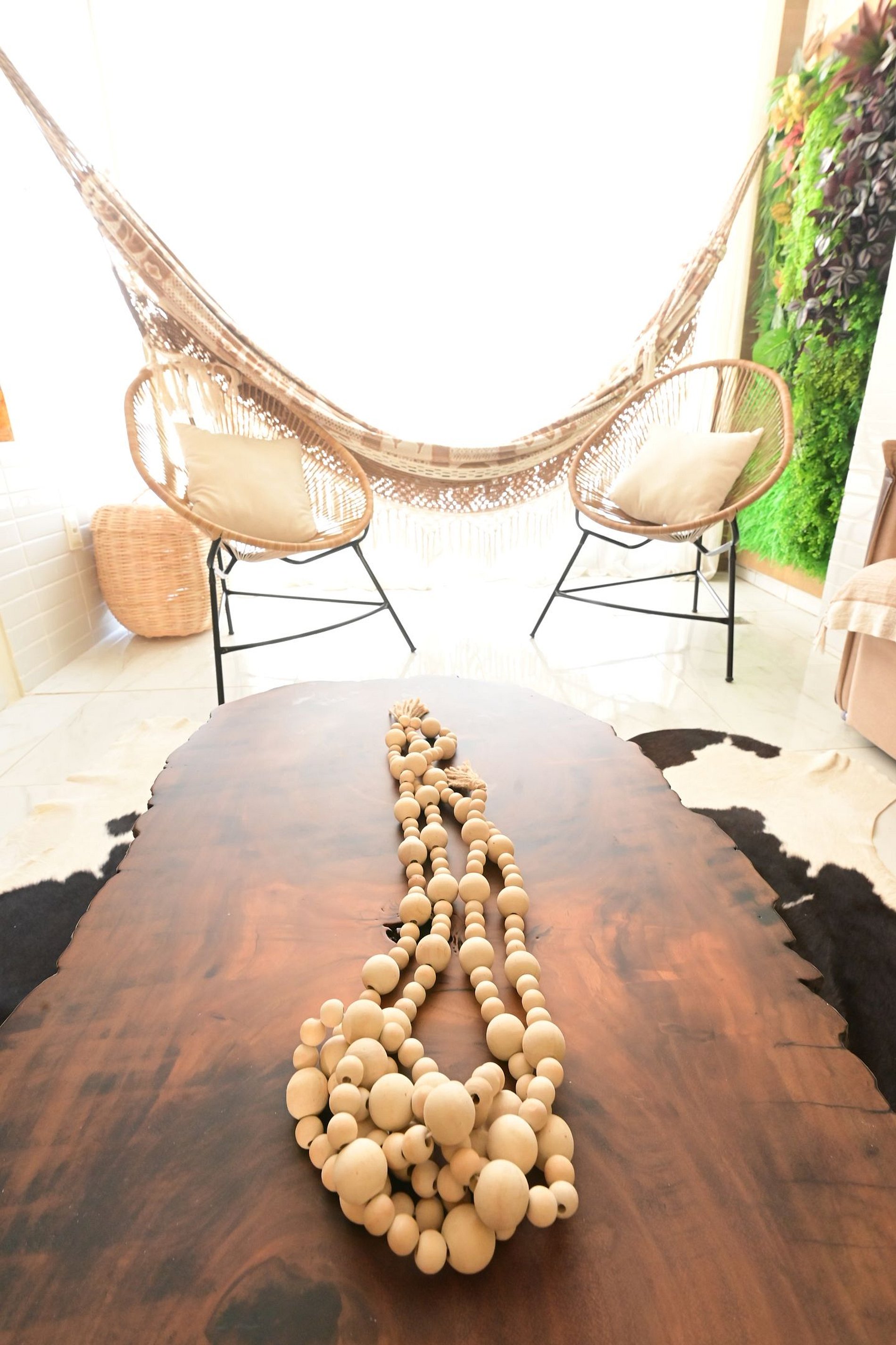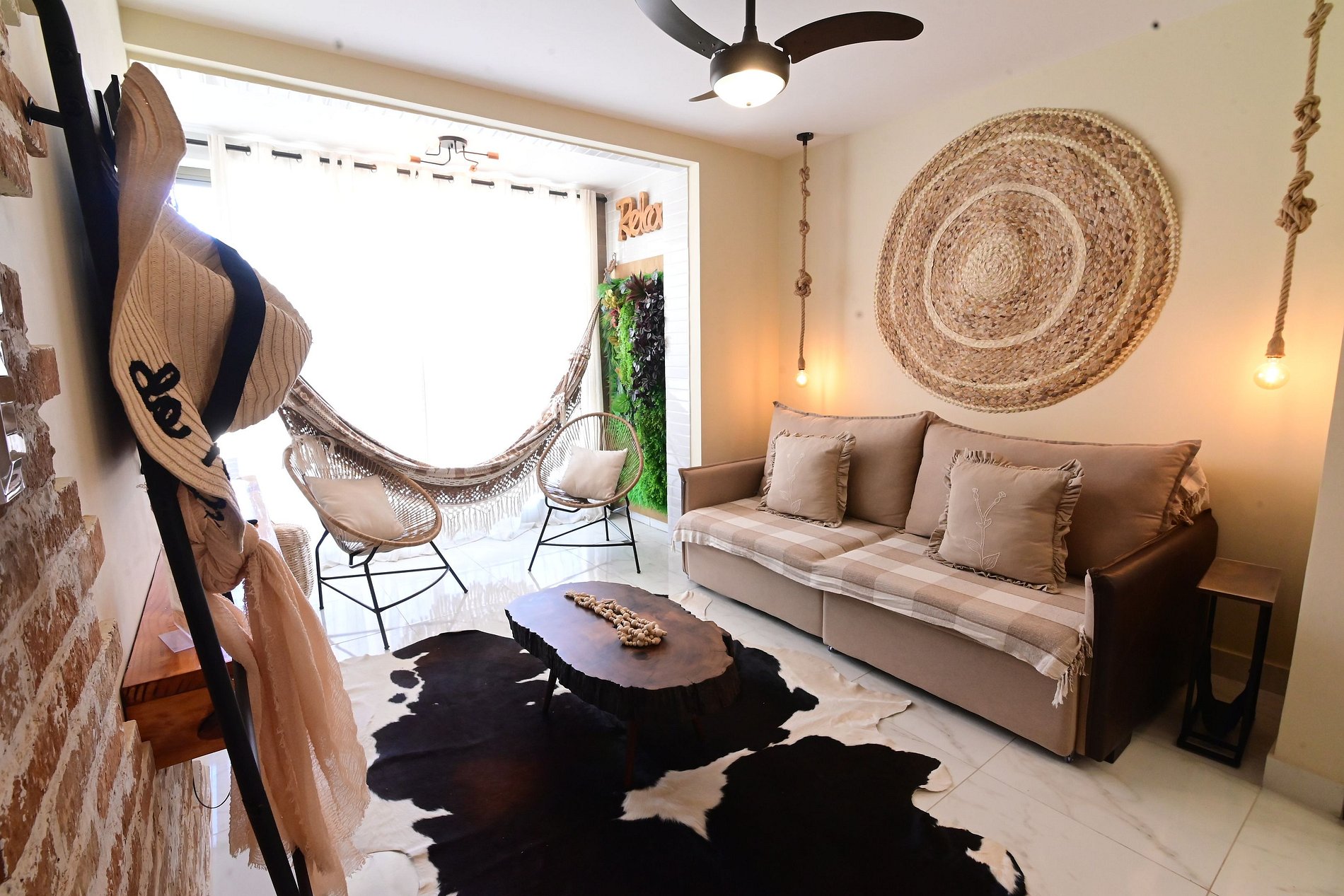 SALA DE JANTAR: com mesa grande para 6 pessoas; Sala de estar com TV Smart, sofá reclinável, cadeiras de descanso e ventilador de teto;