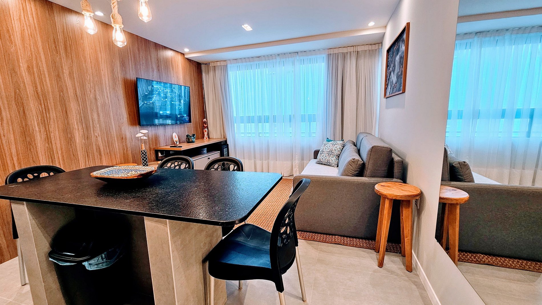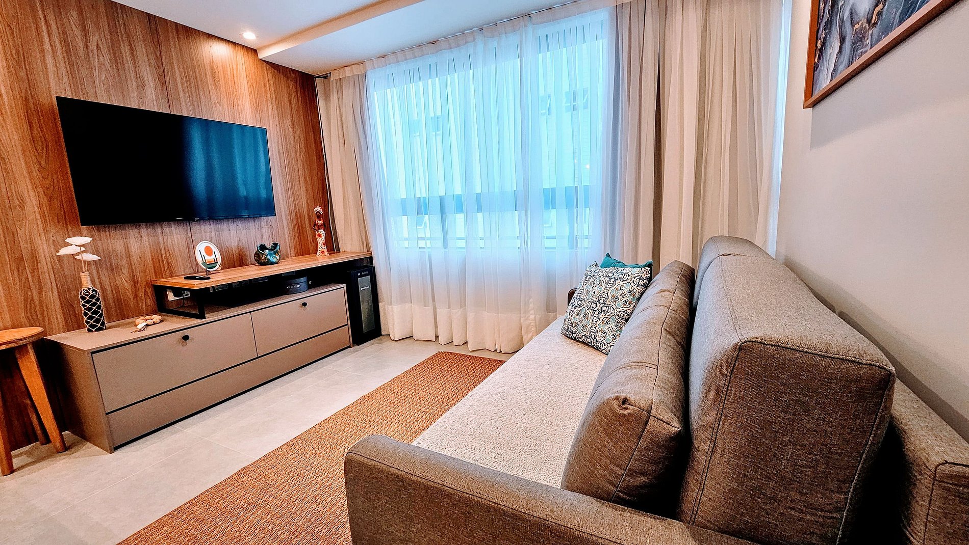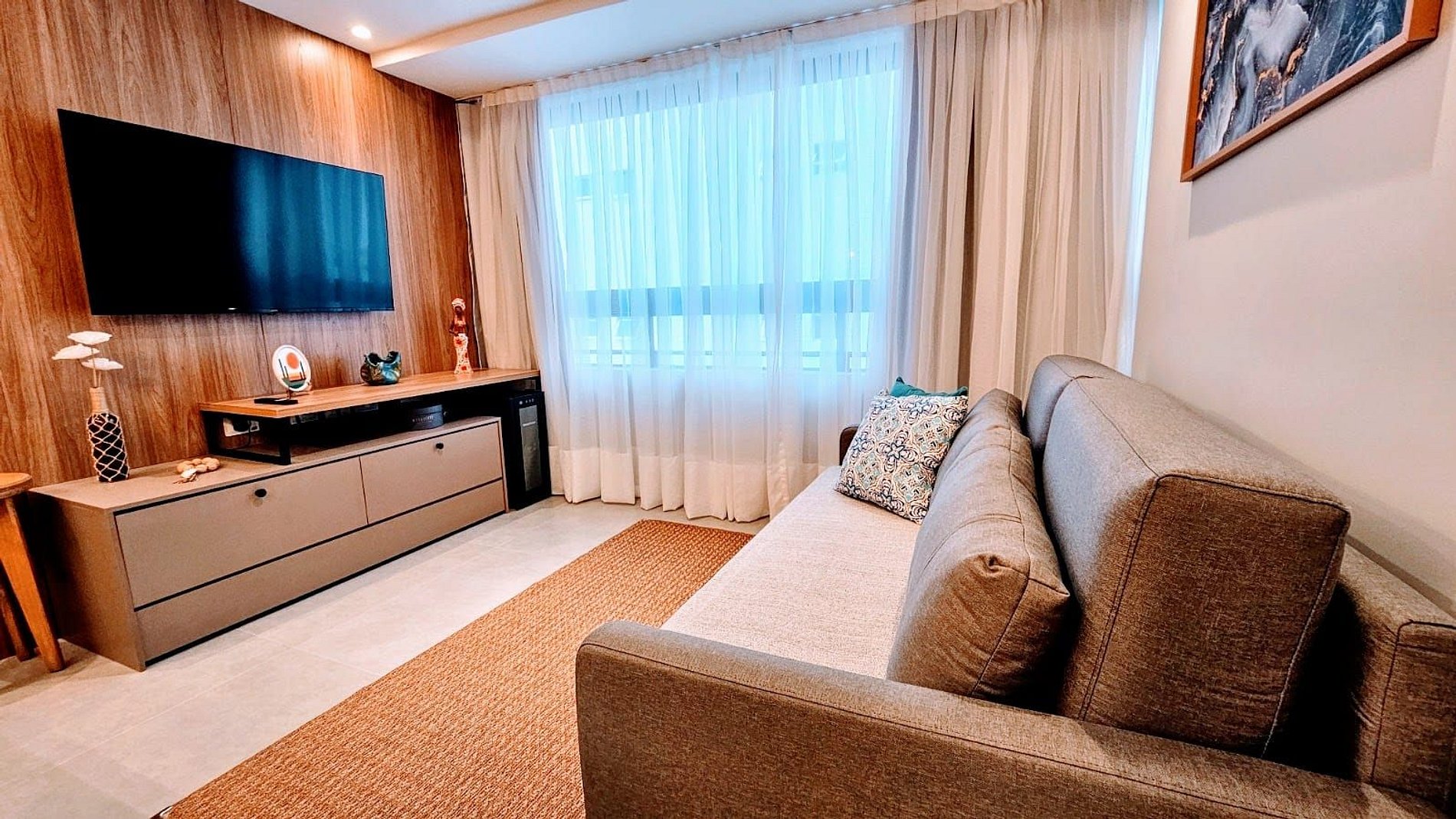 SALA DE ESTAR: Sofá cama super confortável, rack, TV grande Smart com canais abertos, adega, ventilador e cortina com black out.