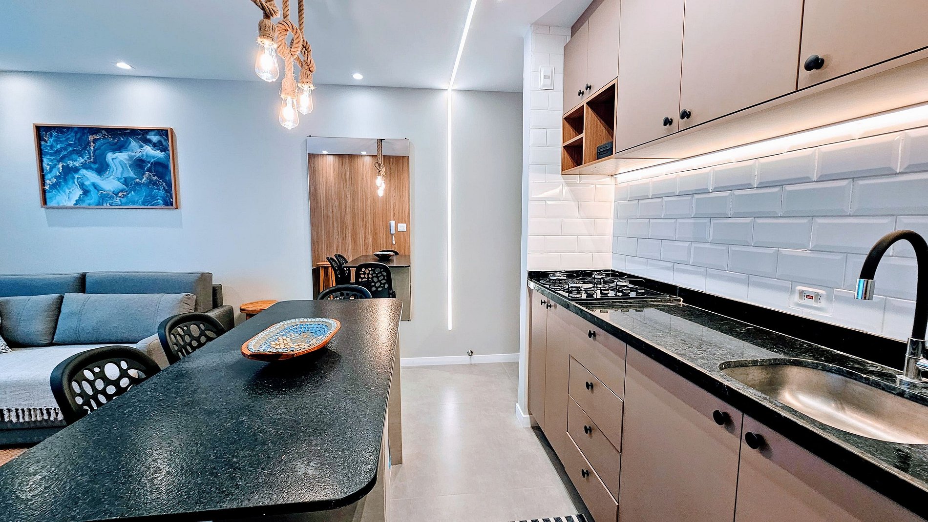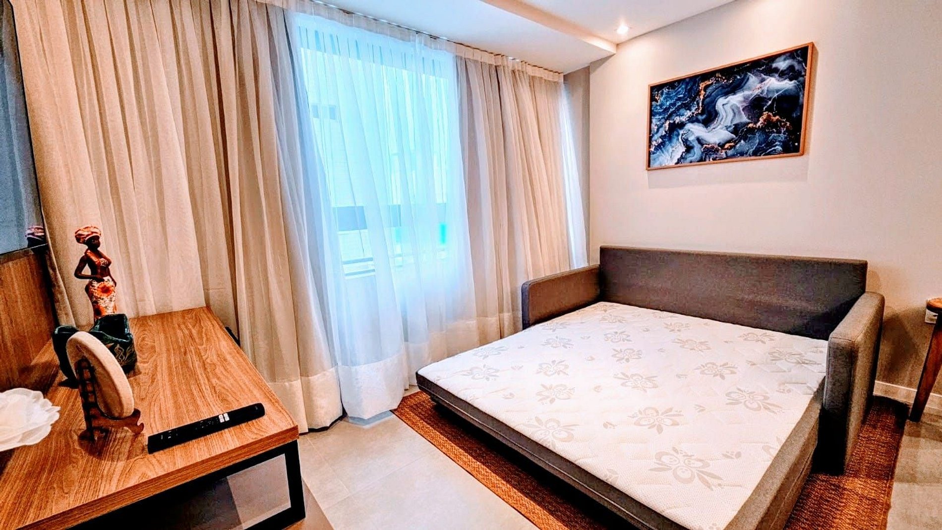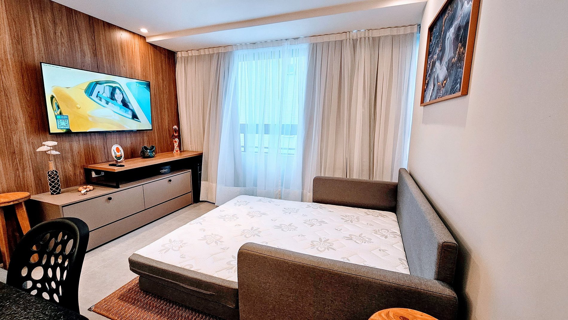 SALA DE ESTAR: Sofá cama super confortável, rack, TV grande Smart com canais abertos, adega, ventilador e cortina com black out.