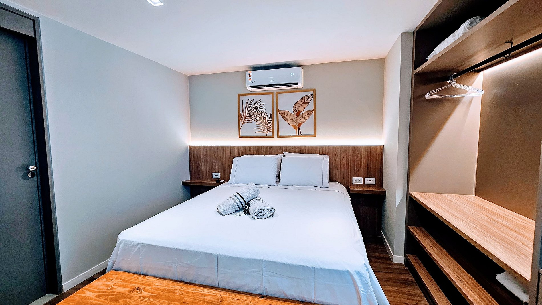 DORMITÓRIO: Cama queen, tv smart grande com canais abertos, armário com cabides, ar condicionado e cortina black out.
