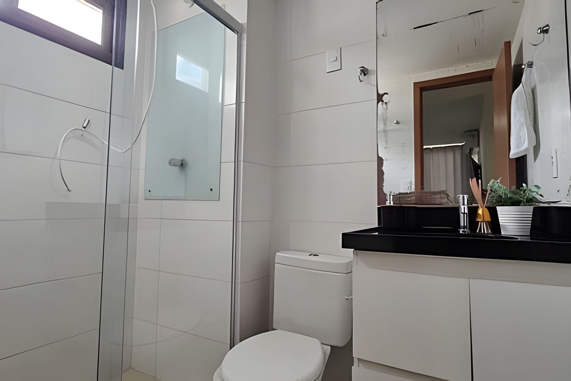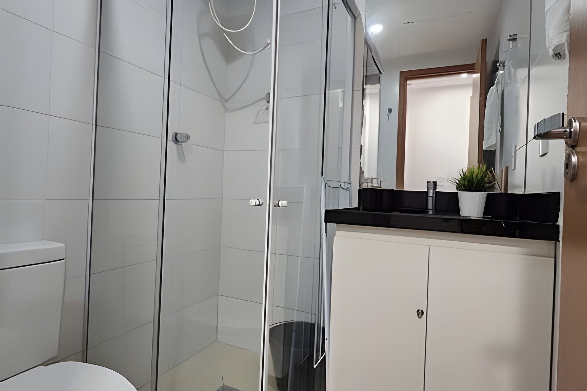 BANHEIRO SOCIAL com água quente e box em vidro.