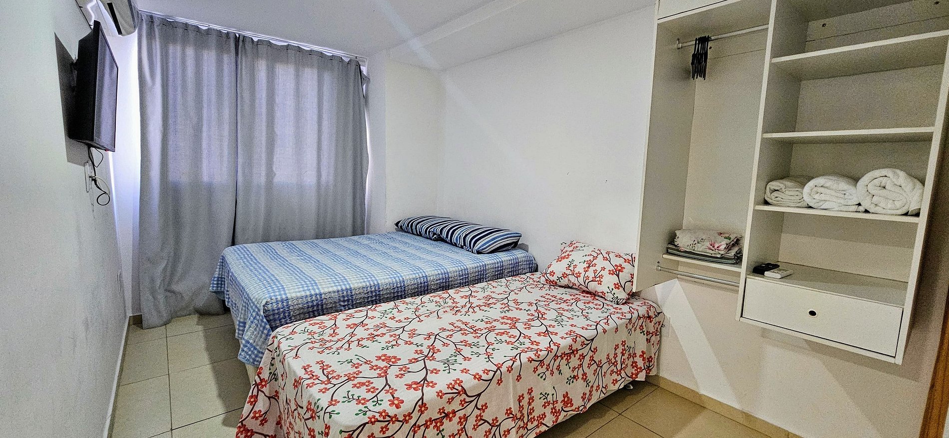 SUÍTE: banheiro com água quente e box em vidro, cama casal, cama solteiro com cama solteiro auxiliar, cortina, tv e ar condicionado.
