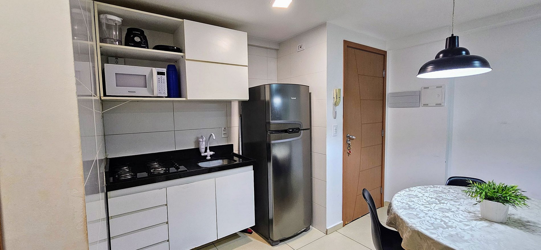 COZINHA: mesa com 4 cadeiras, geladeira com freezer, cooktop a gás 4 queimadores, sanduicheira, forno microondas, liquidificador e todos os utensílios necessários para a preparação de refeições, tais como copos, pratos, talheres, panelas, xícaras, filtro para café, torneira com filtro d´água. Oferece varal de roupas.