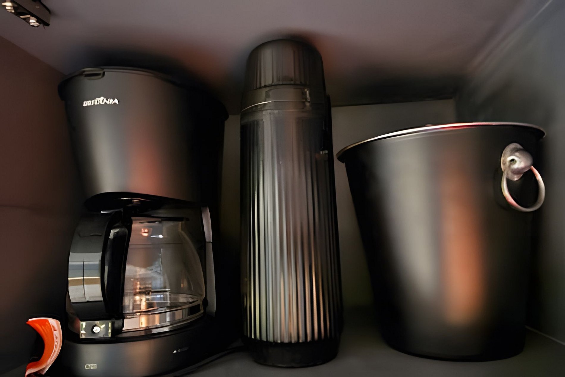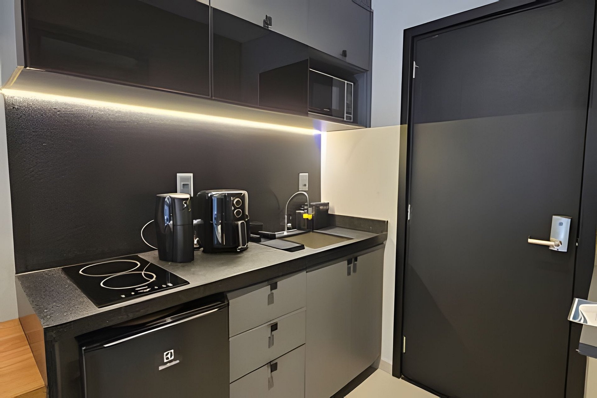 COZINHA: Bancada com cooktop por indução 2 bocas, pia, geladeira frigobar, forno microondas, airfryer, sanduicheira, cafeteira comum, cafeteira de cápsulas, liquidificador, garrafa térmica, balde para gelo, pratos, xícaras, talheres, panelas e demais utensílios para o preparo de refeições.