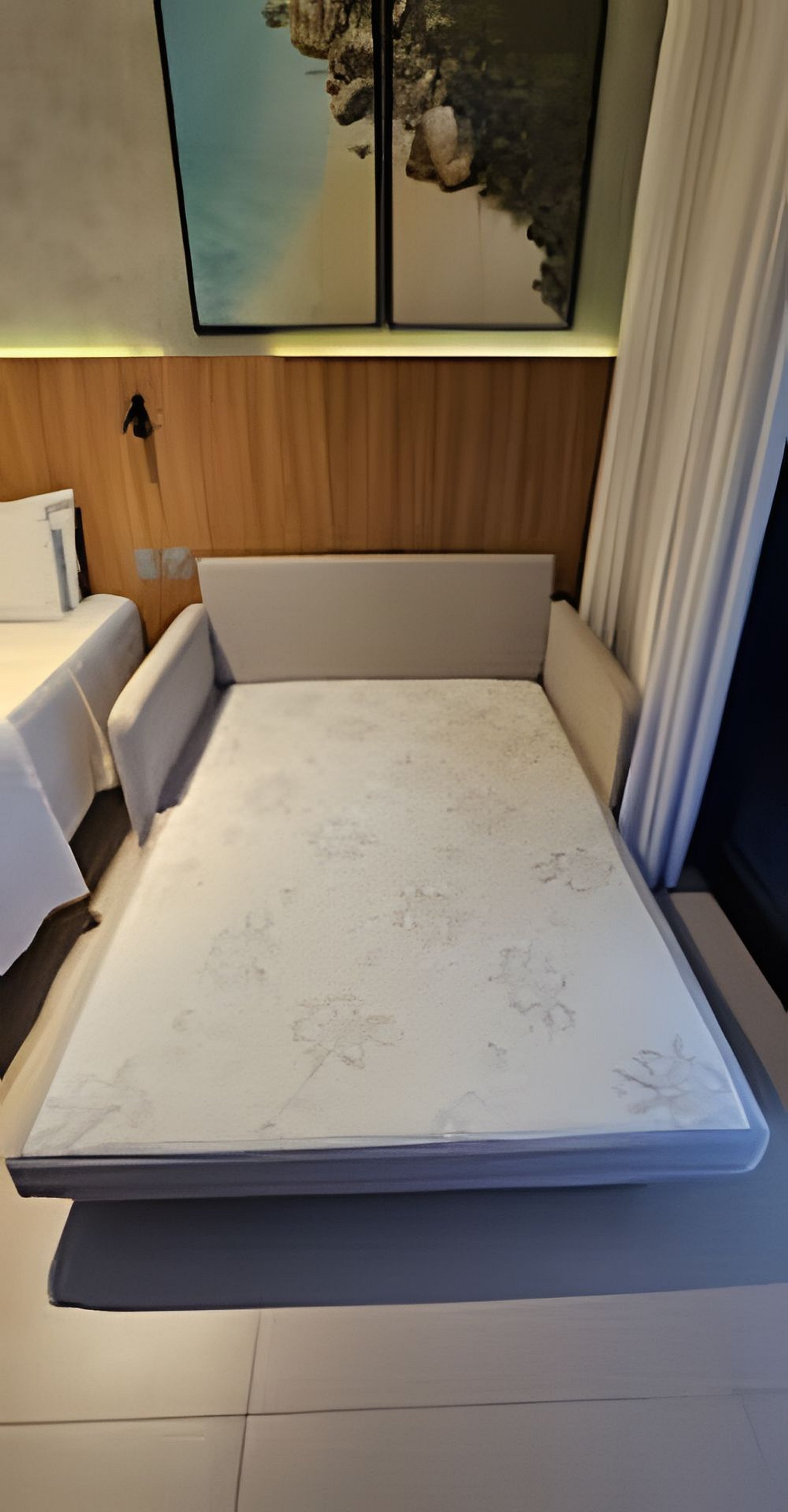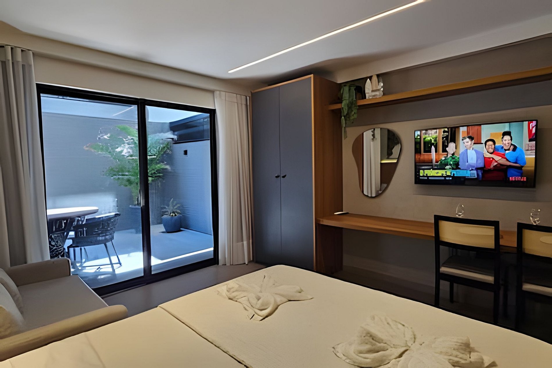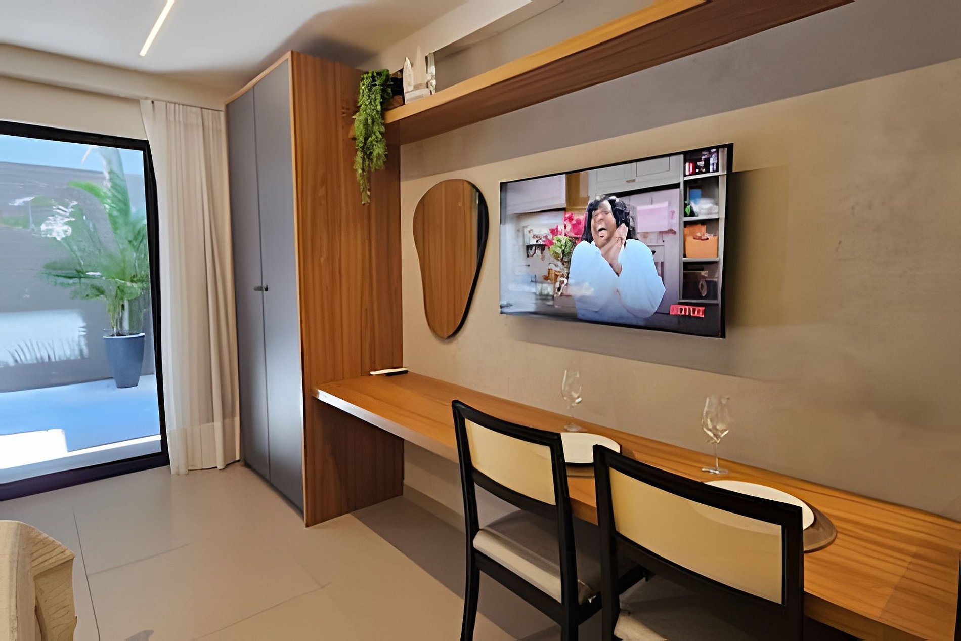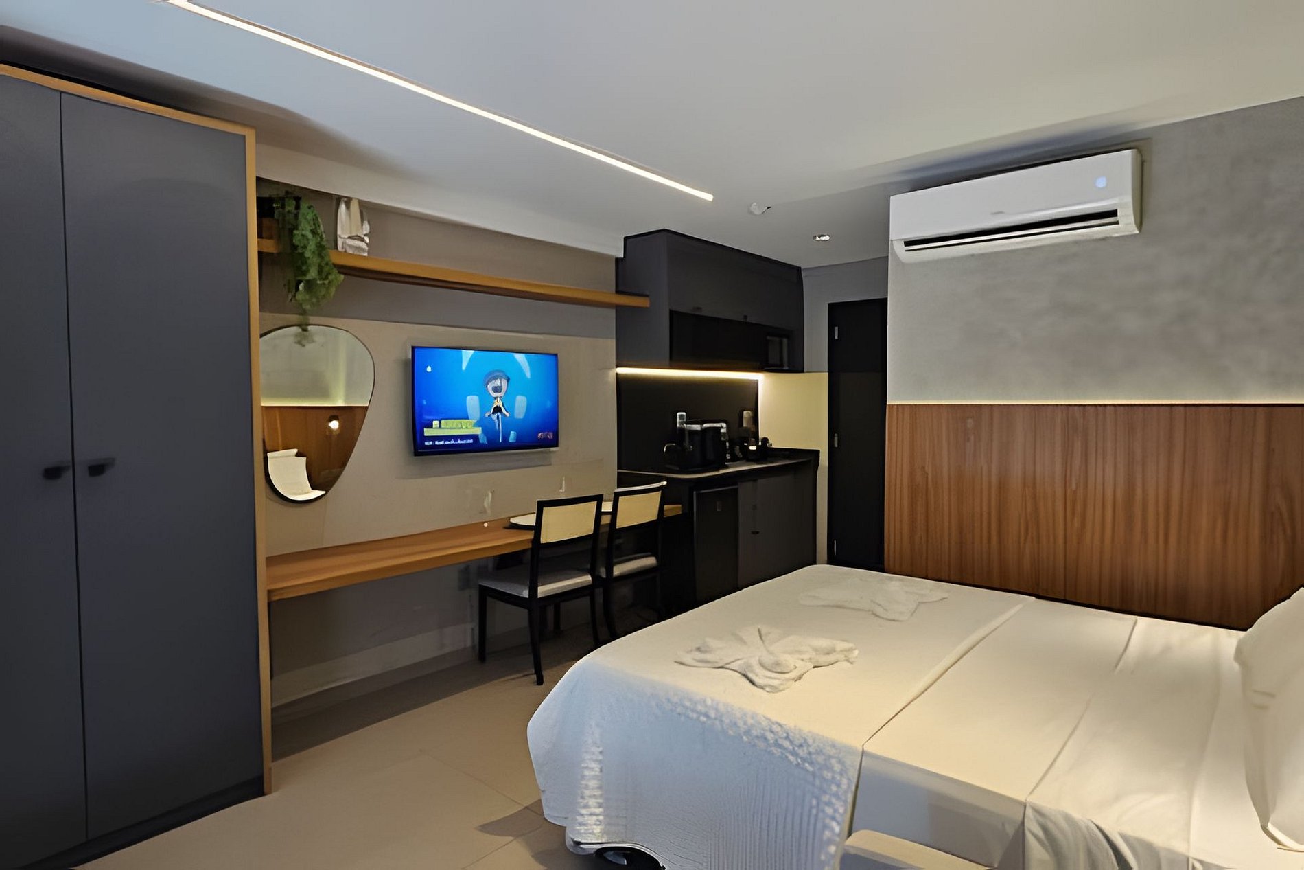 QUARTO/SALA: Cama baú Queen size, sofá cama casal com almofadas, guarda roupas com cabide, ferro de passar roupas, cortinas com black out, bancada/mesa com 2 caderias, TV Smart com canais abertos disponíveis.