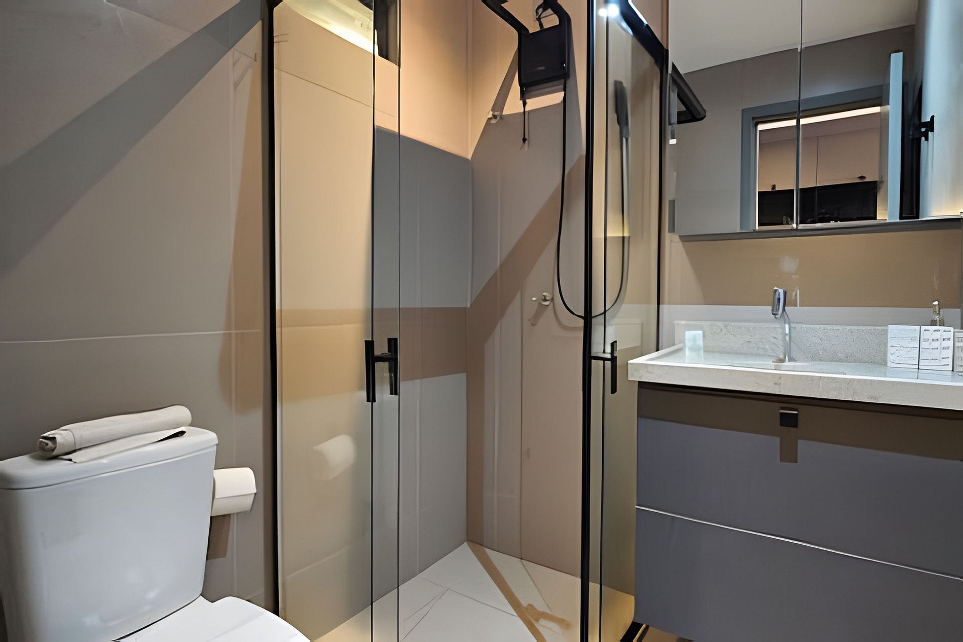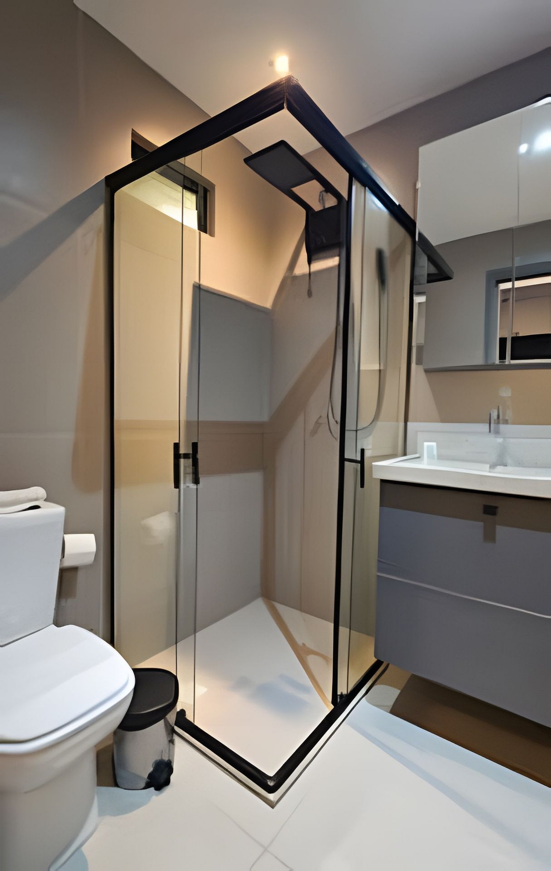 BANHEIRO: box em vidro, super ducha de água quente e secador de cabelos.