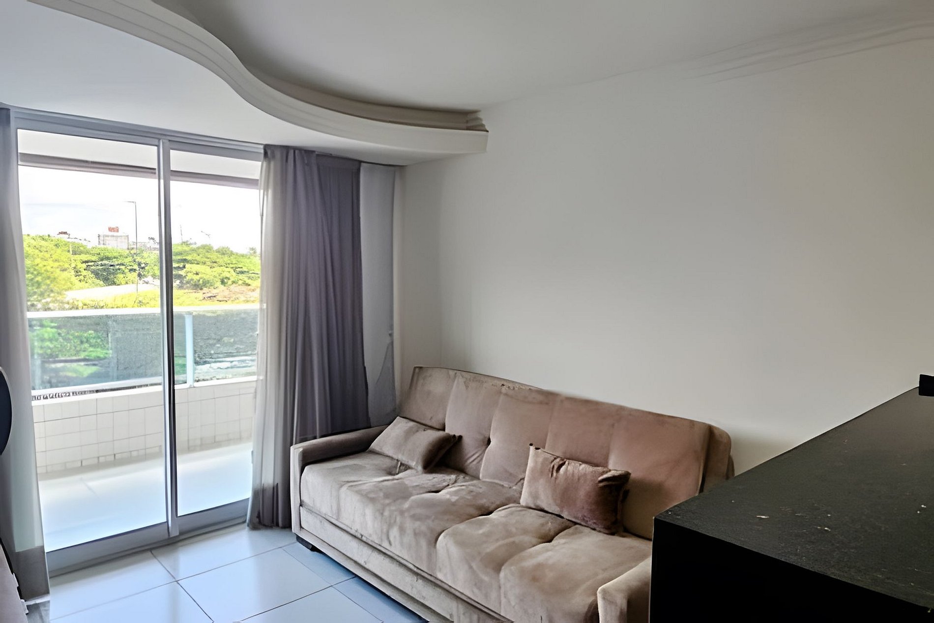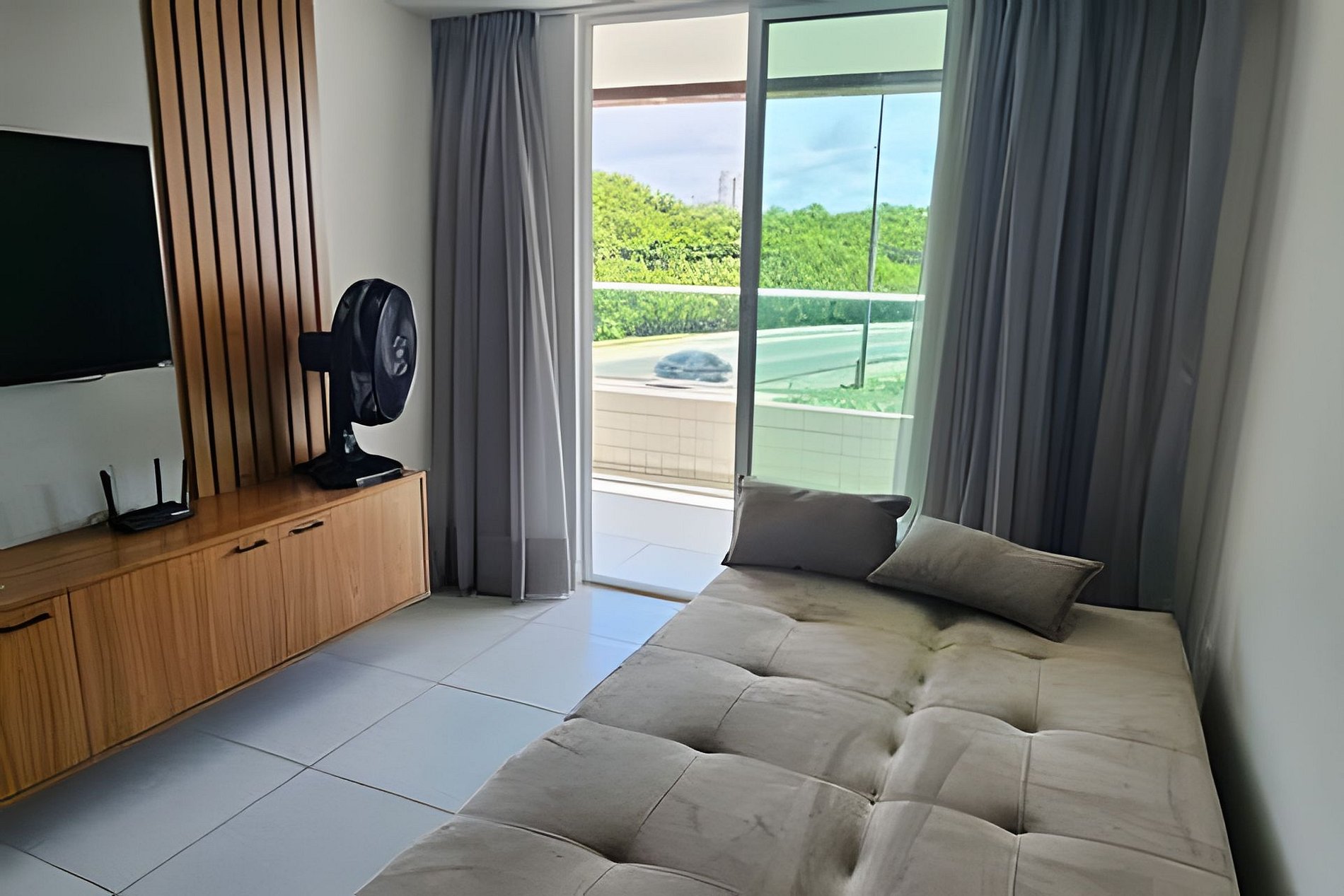 SALA com TV smart e canais abertos, sofá cama, cortina black out, ventilador portátil, rack e espelho.