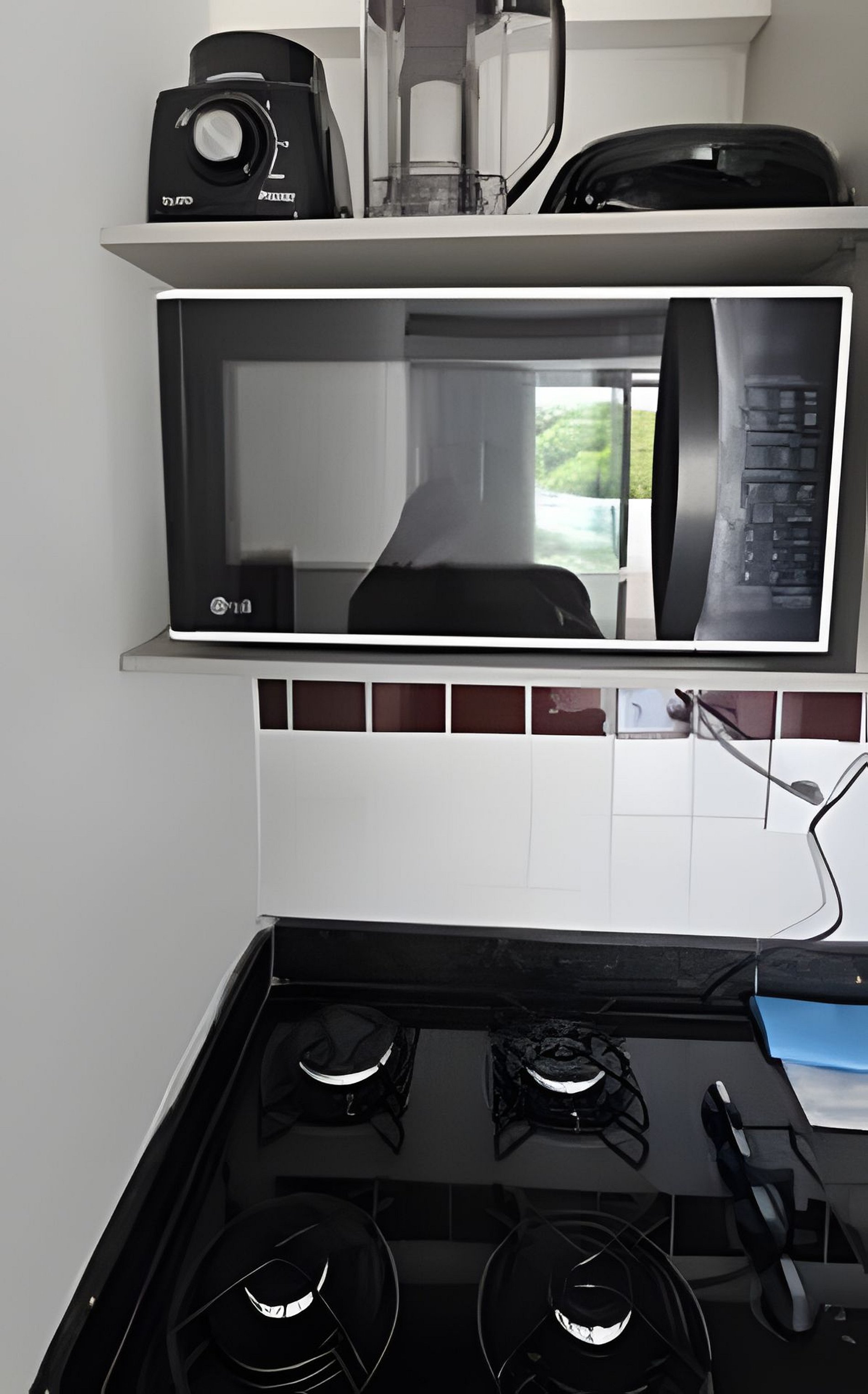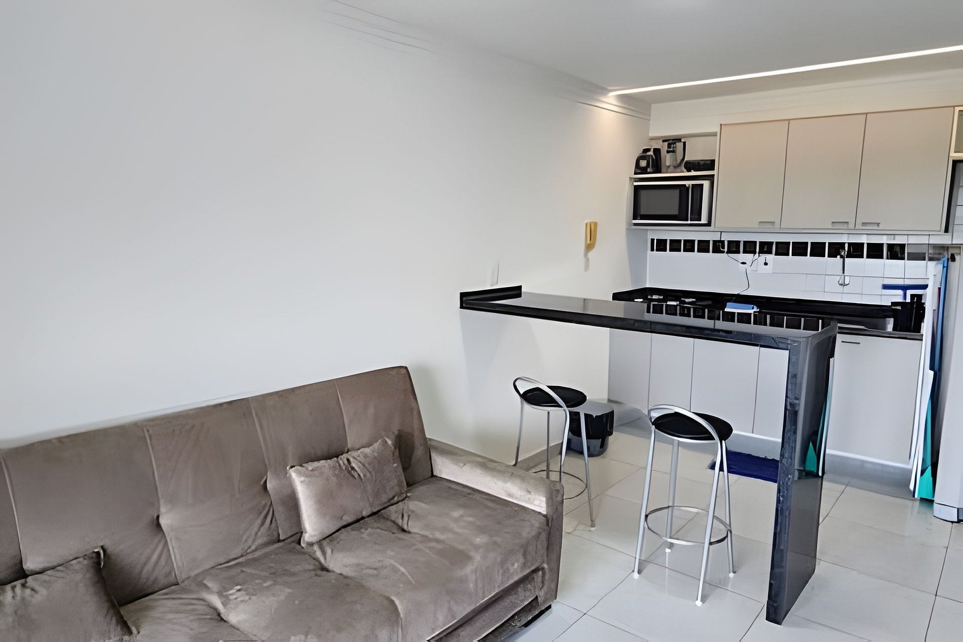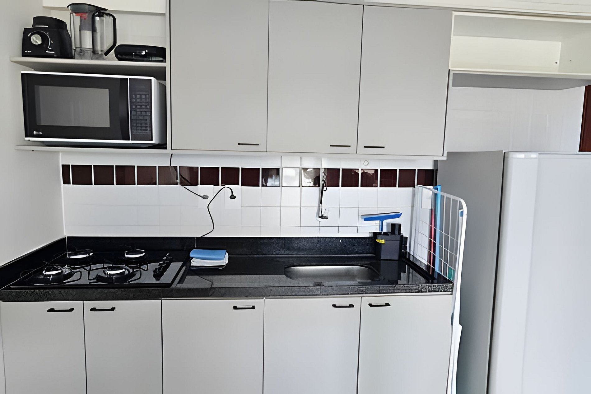 COZINHA com geladeira, bancada com 2 banquetas, pia, cooktop 4 bocas a gás, forno microondas, sanduicheira, liquidificador, louças, panelas, cuscuzeira, talheres, copos e demais utensílio para o preparo de refeições.